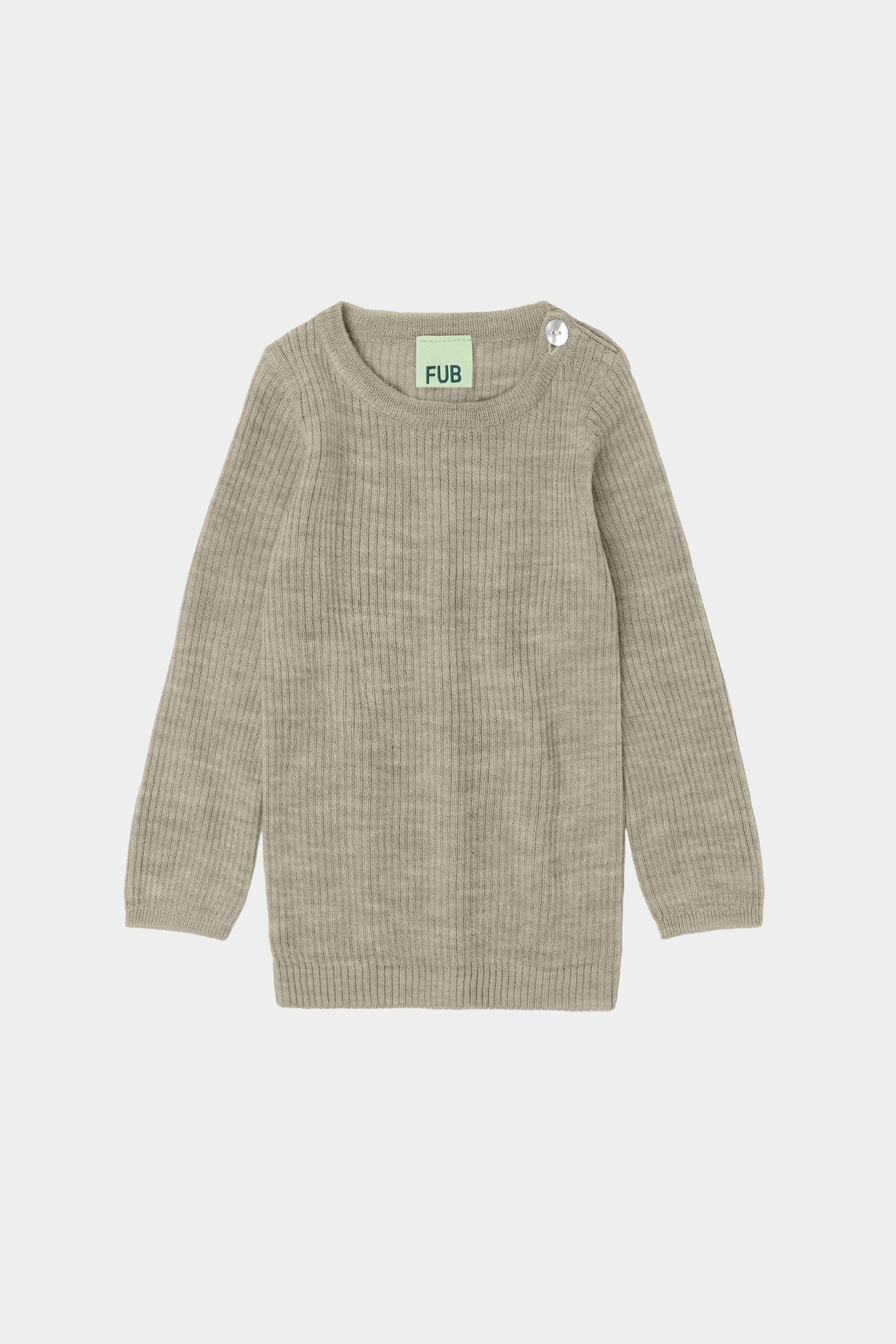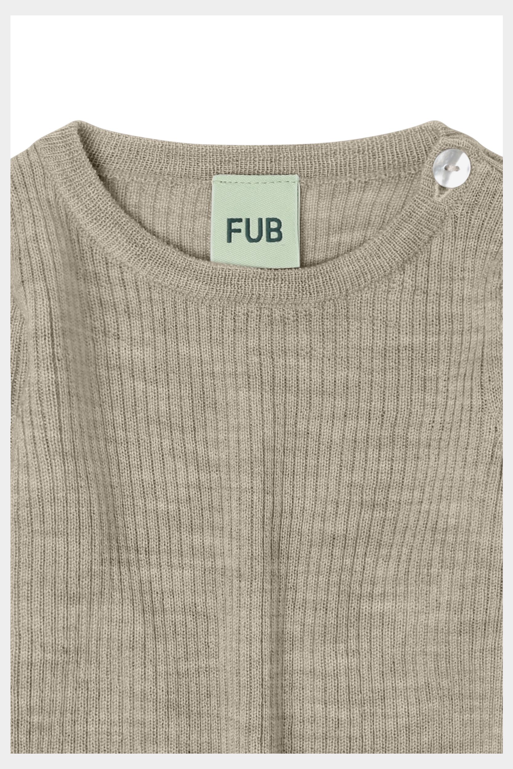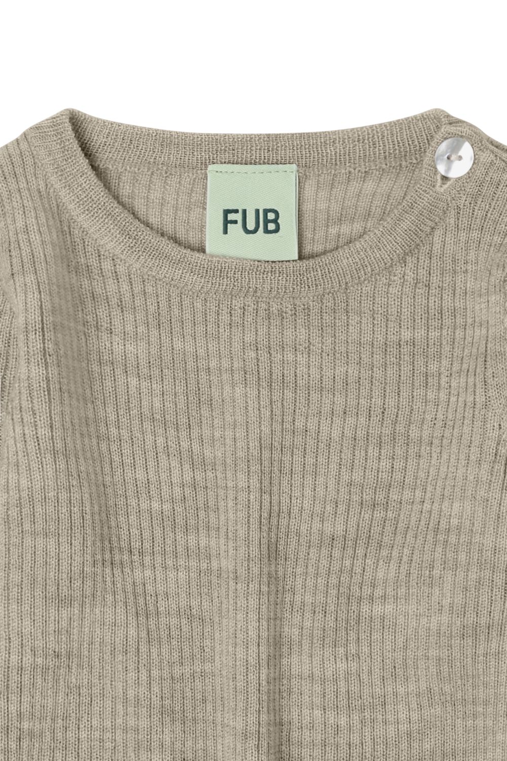 Denne langærmede babybluse, som er strikket i en klassisk ribstruktur, er en FUB klassiker. Blusen har en praktisk knaplukning på skulderen med perlemorsknapper. Den har en lige smal pasform og smalle ribkanter og er strikket i ekstrafin merinould. Vores merinould er BLUESIGN® og RWS certificeret, fri for skadelig kemi og stammer fra får, der ikke har været udsat for mulesing.