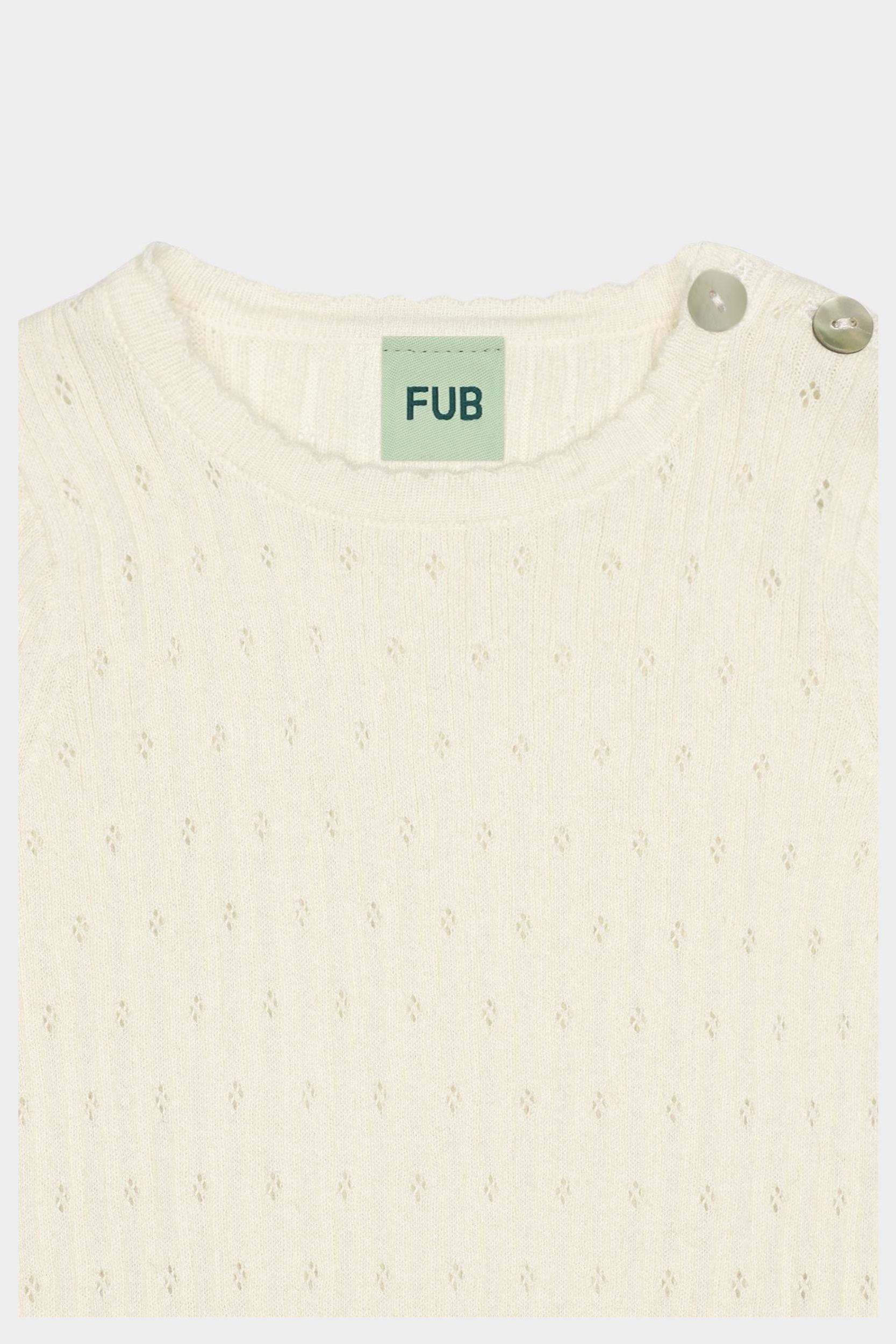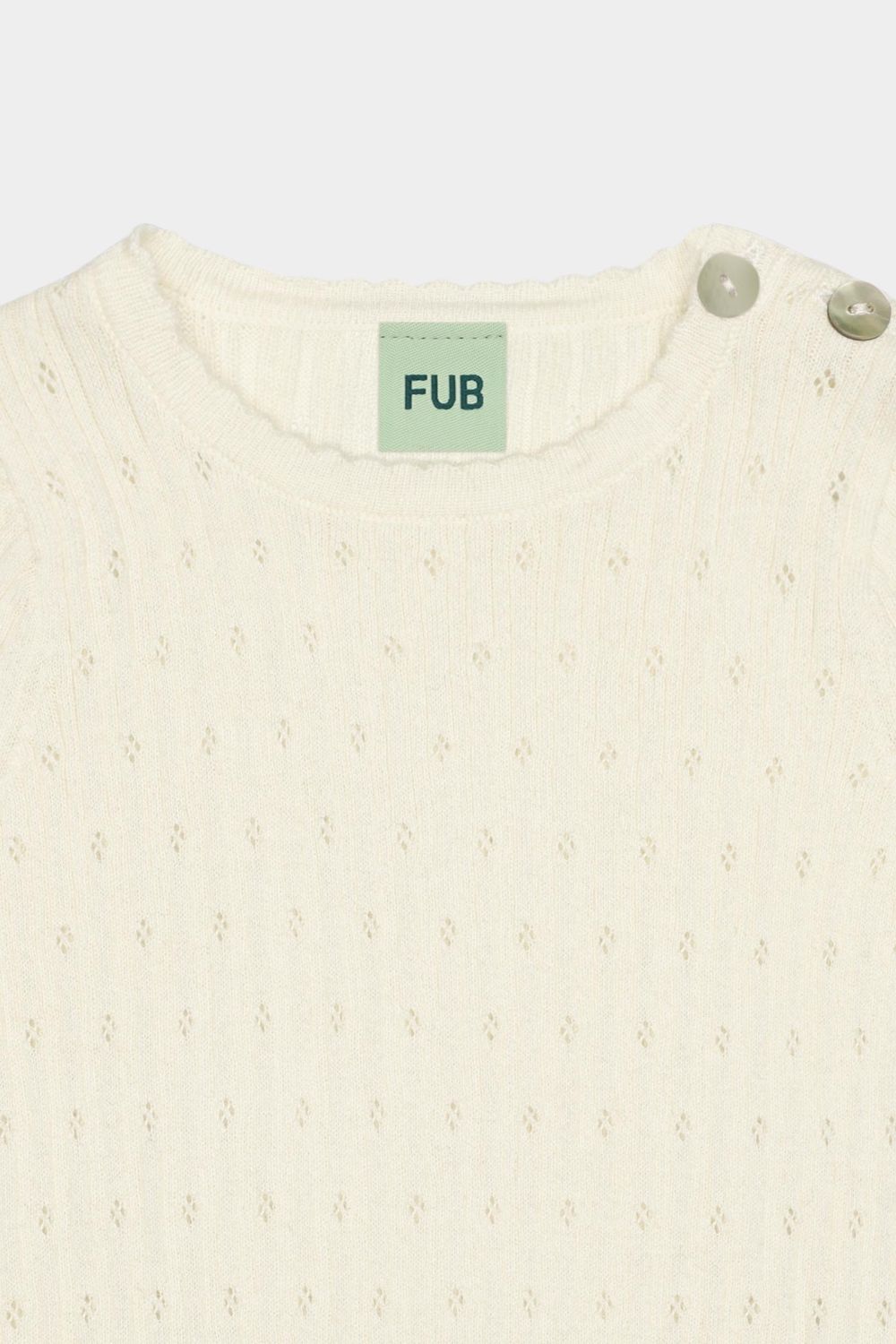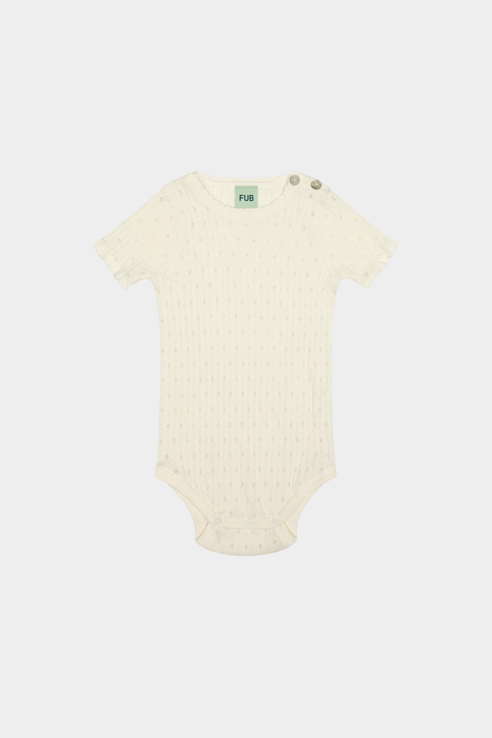 Denne bodystocking er strikket i et fint pointelle mønster. Bodyen har korte ærmer og en strikket blondedetalje ved hals og ærmer. Bodyen har en praktisk lukning ved skulderen med perlemorsknapper og trykknapper forneden.