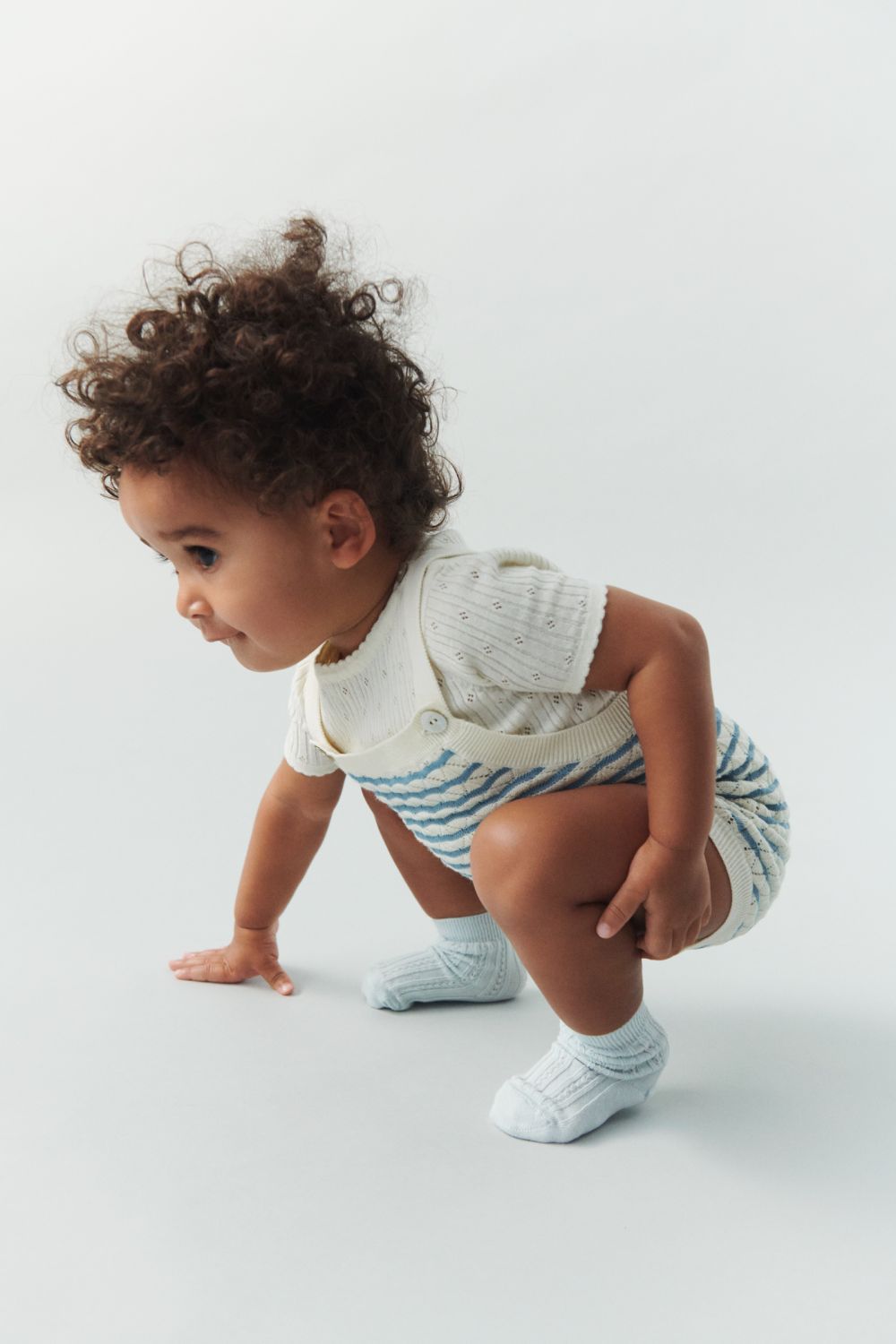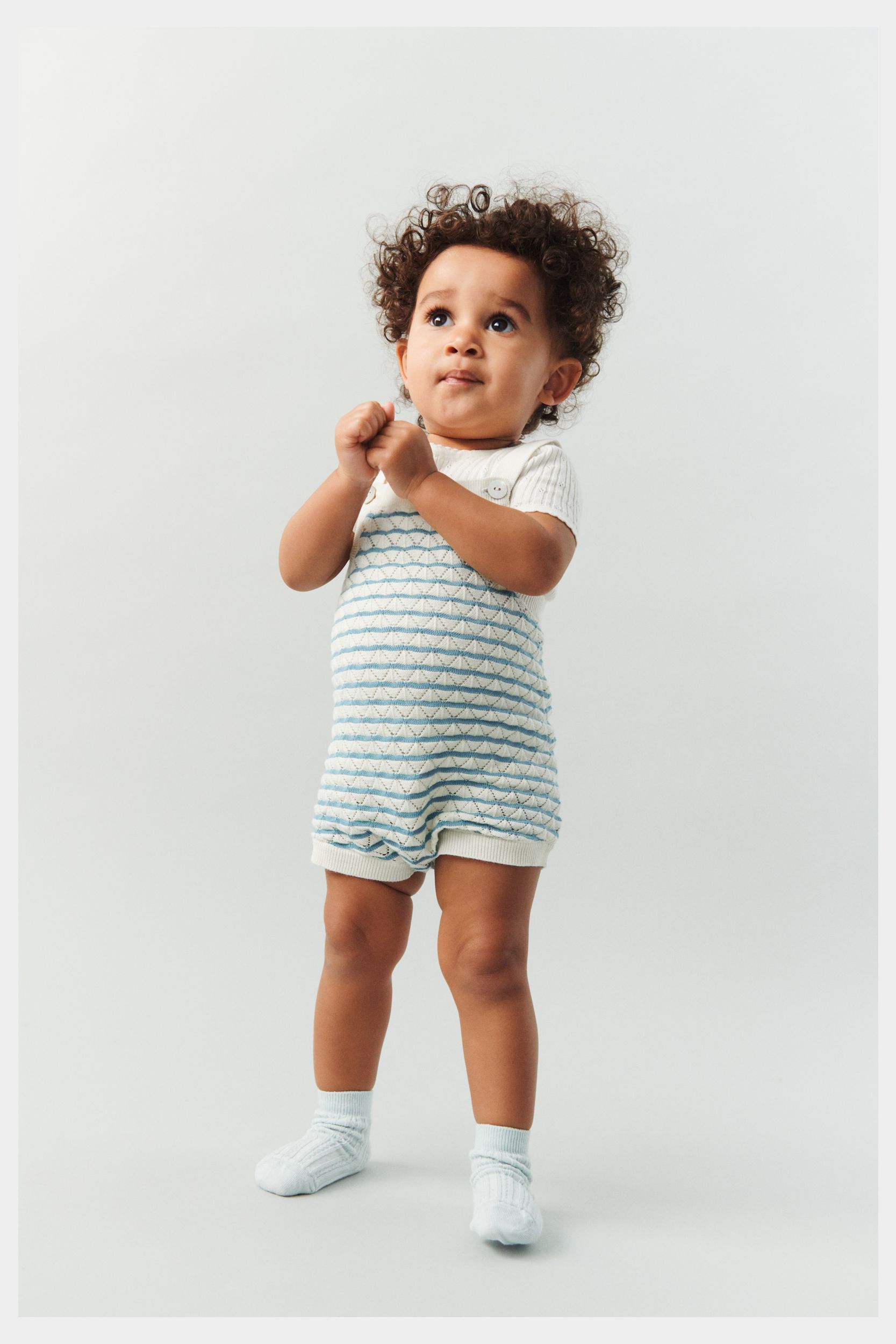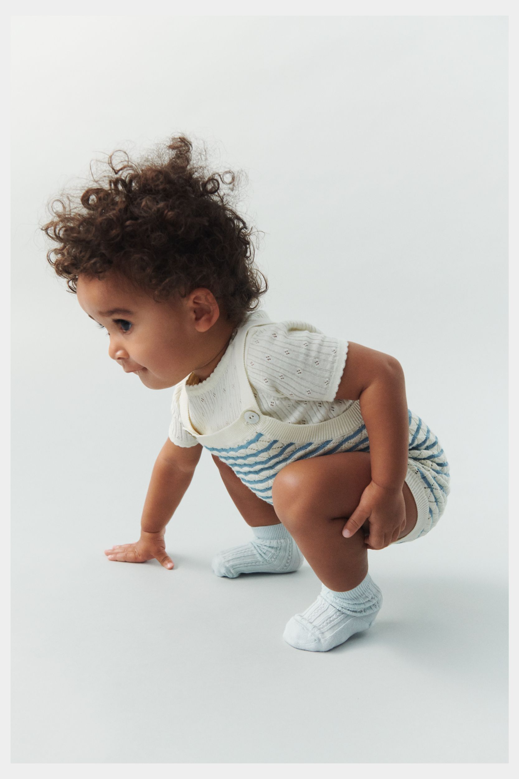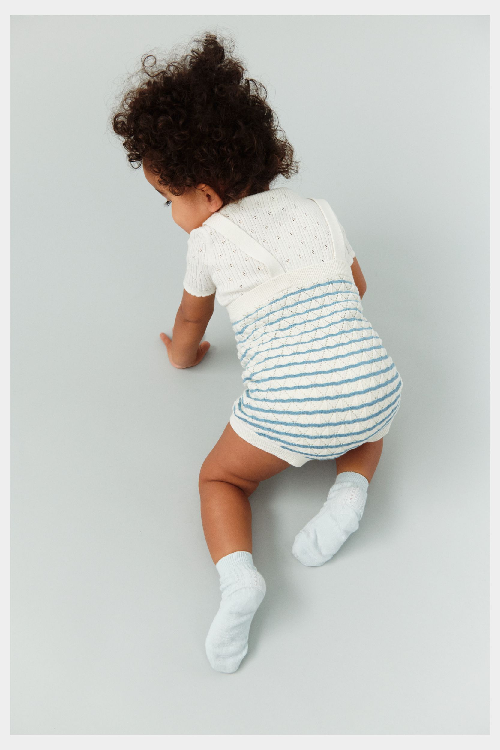 Denne bodystocking er strikket i et fint pointelle mønster. Bodyen har korte ærmer og en strikket blondedetalje ved hals og ærmer. Bodyen har en praktisk lukning ved skulderen med perlemorsknapper og trykknapper forneden.