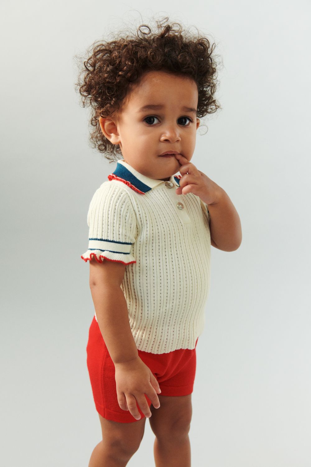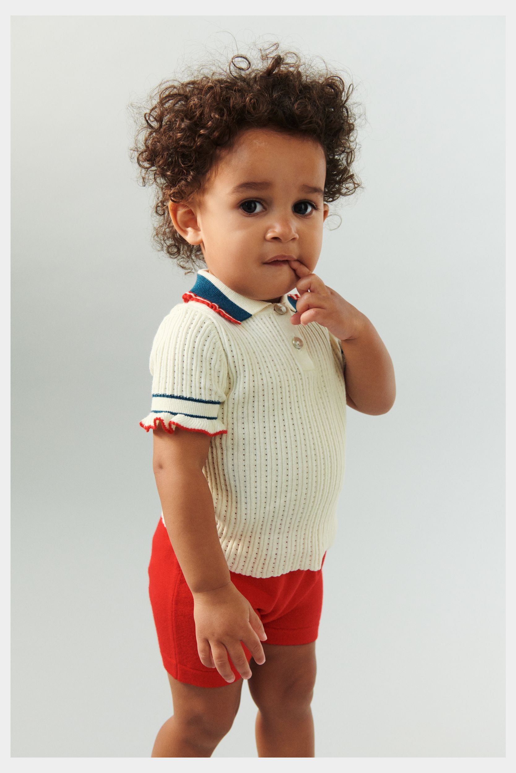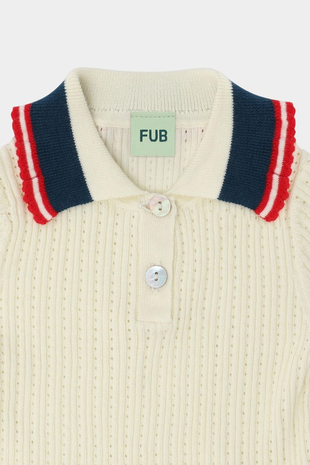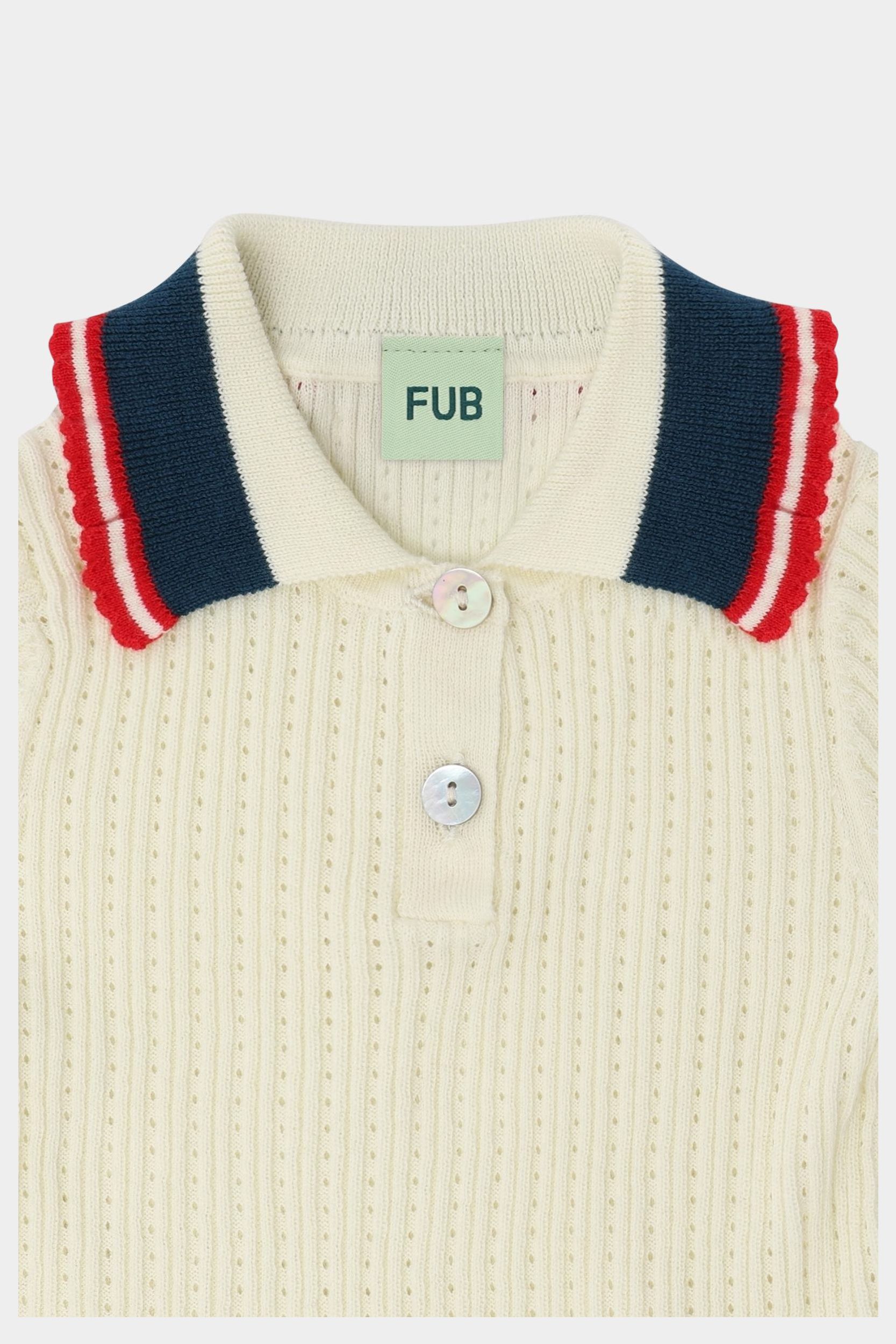 Denne kortærmede polo er strikket i en dekorativ pointellestruktur og er designet med en strikket flæsedetalje med kontrastfarvet kant på ærmer og krave. Poloen har frontlukning med perlemorsknapper og en lille stribedetalje på ærmekanterne. Den har en lige, smal pasform og er lavet af økologisk bomuld.