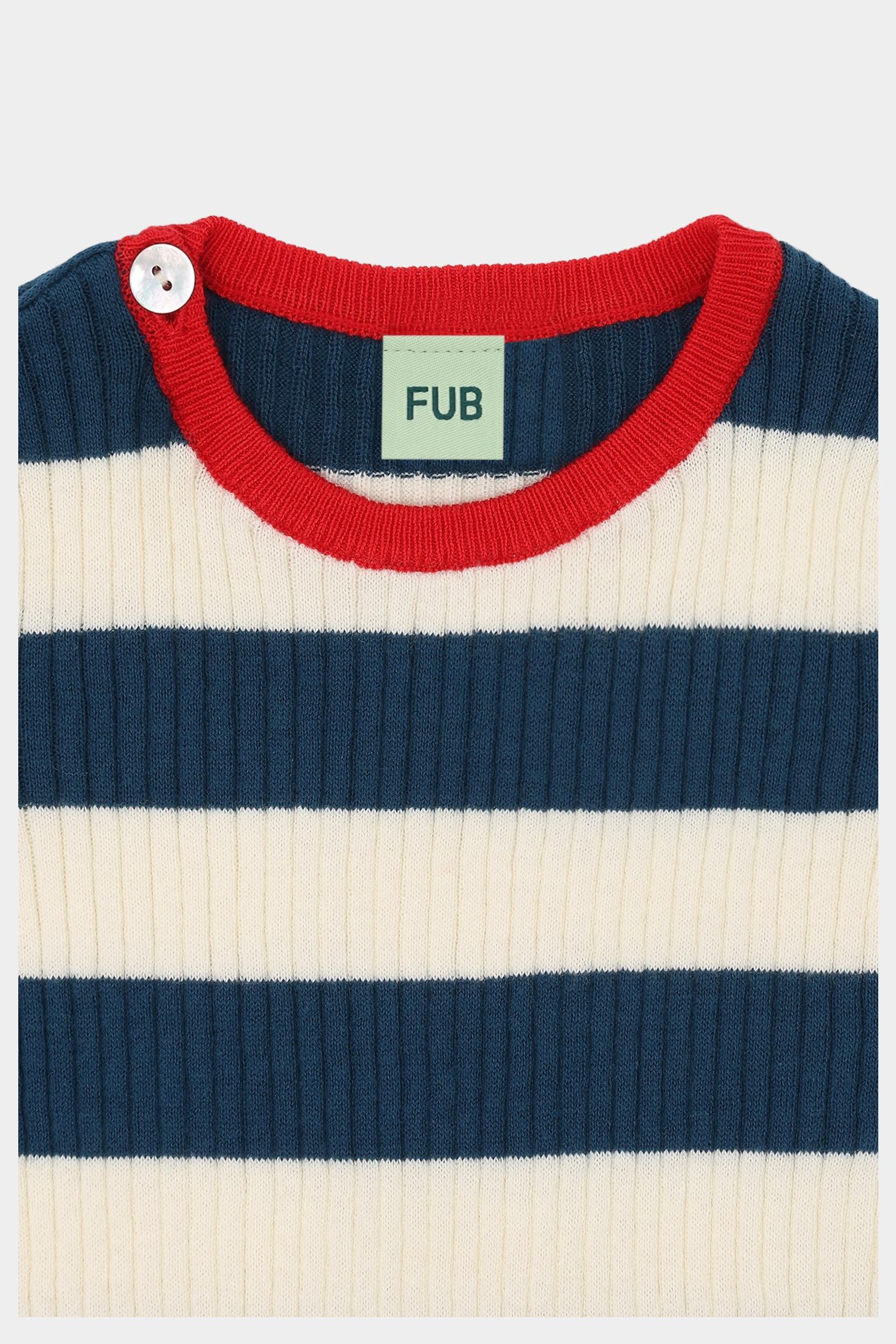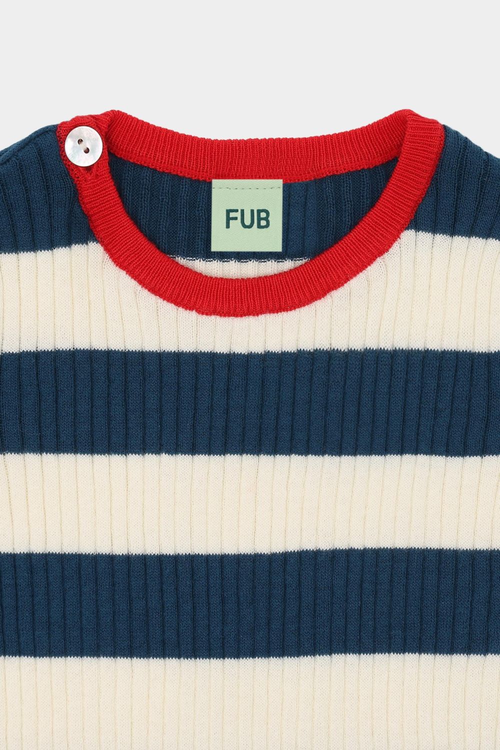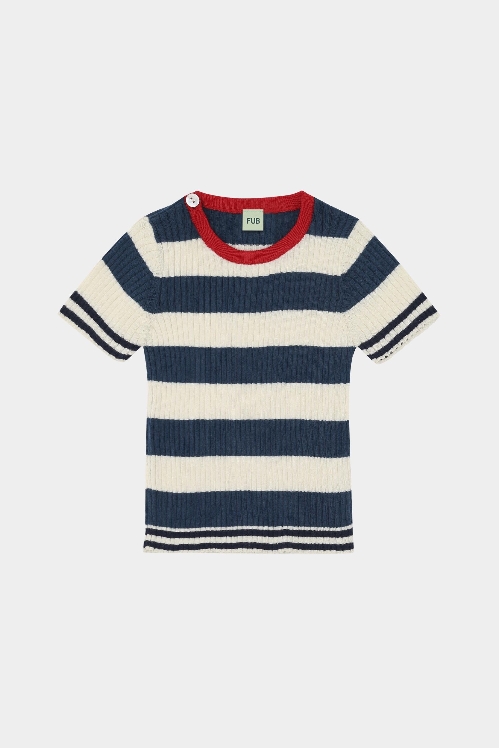 Denne kortærmede t-shirt er strikket i en stribet ribstruktur. Den er designet med rund kontrastfarvet halskant, ribstrikkede kanter med smalle striber og en praktisk knaplukning på skulderen med perlemorsknapper. T-shirten har en smal pasform og er lavet af økologisk bomuld.