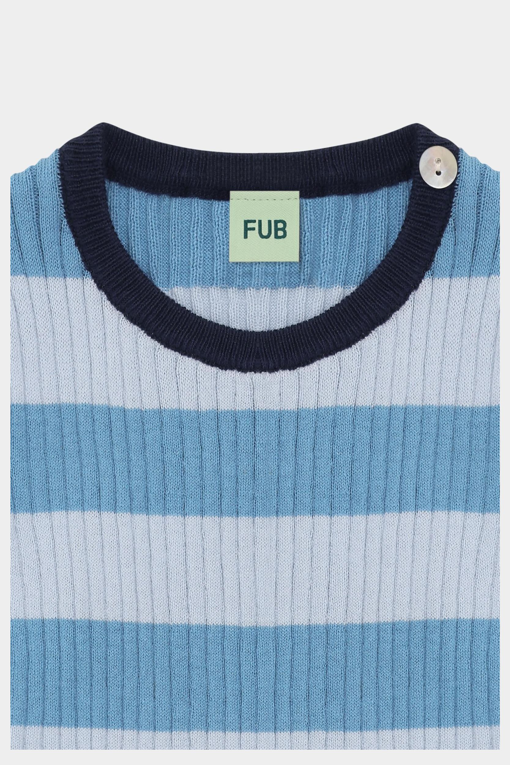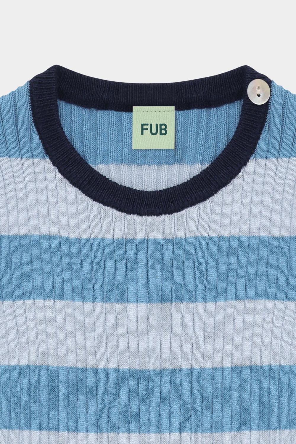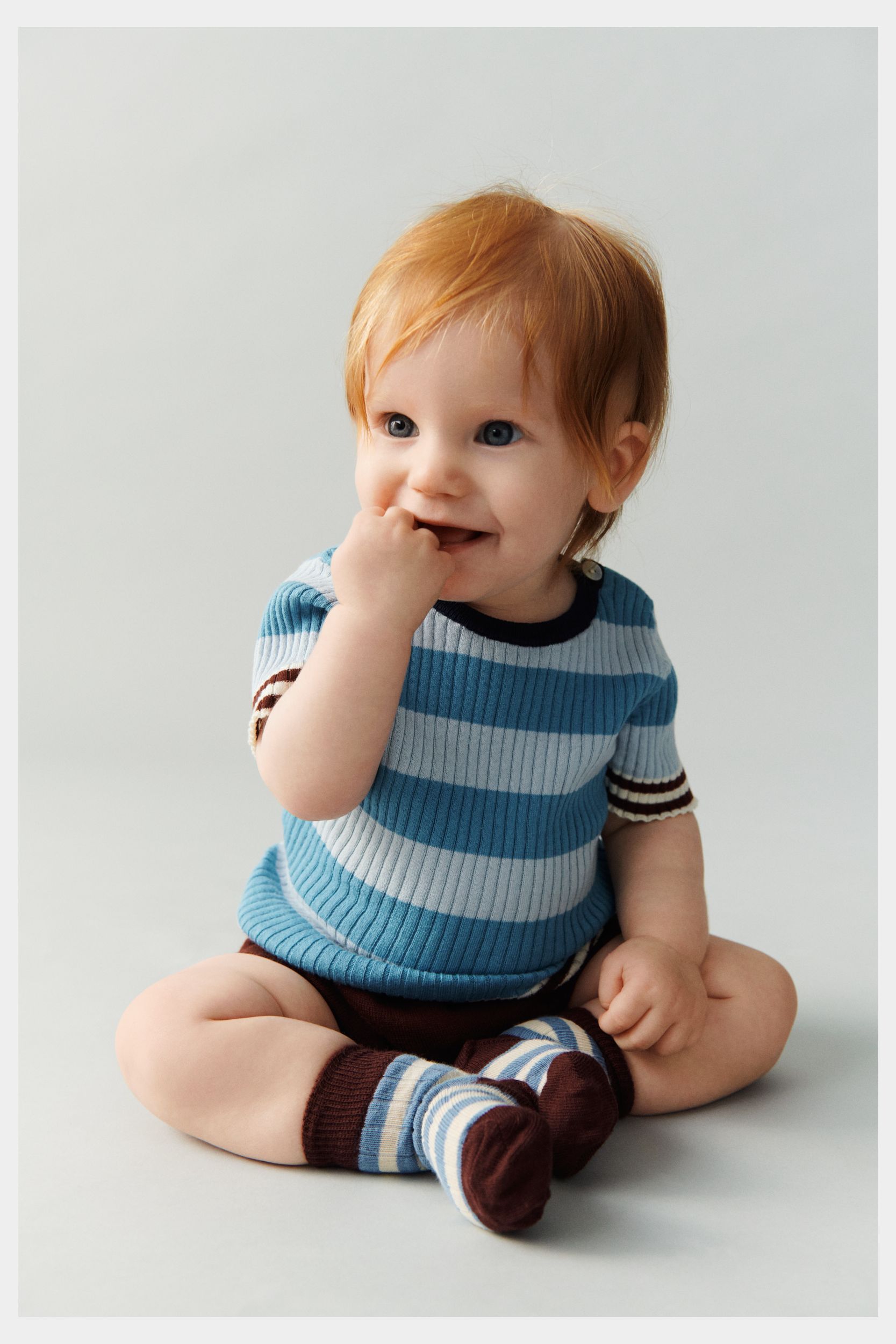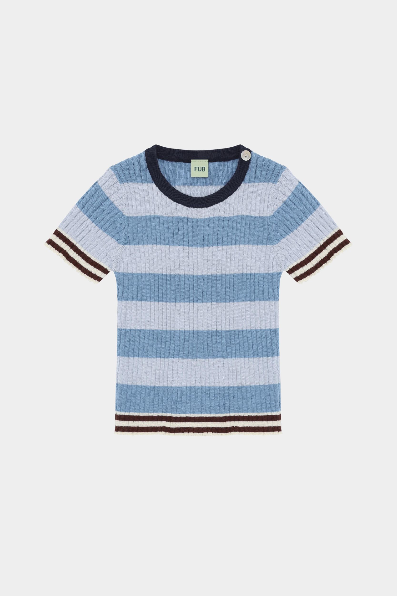 Denne kortærmede t-shirt er strikket i en stribet ribstruktur. Den er designet med rund kontrastfarvet halskant, ribstrikkede kanter med smalle striber og en praktisk knaplukning på skulderen med perlemorsknapper. T-shirten har en smal pasform og er lavet af økologisk bomuld.