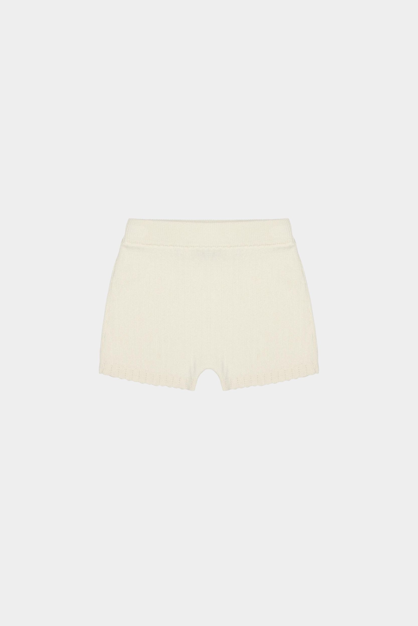 Disse babyshorts er strikket i en delikat ribstruktur og har elastikkant i taljen, som sikrer en komfortabel pasform. Shortsene har en afslappet pasform med lavt skridt, lige ben og dekorative ribkanter med pointelledetaljer. Lavet af økologisk bomuld.