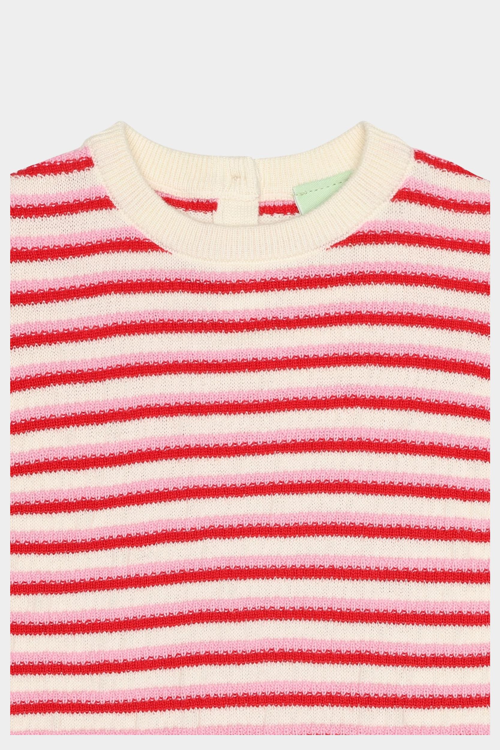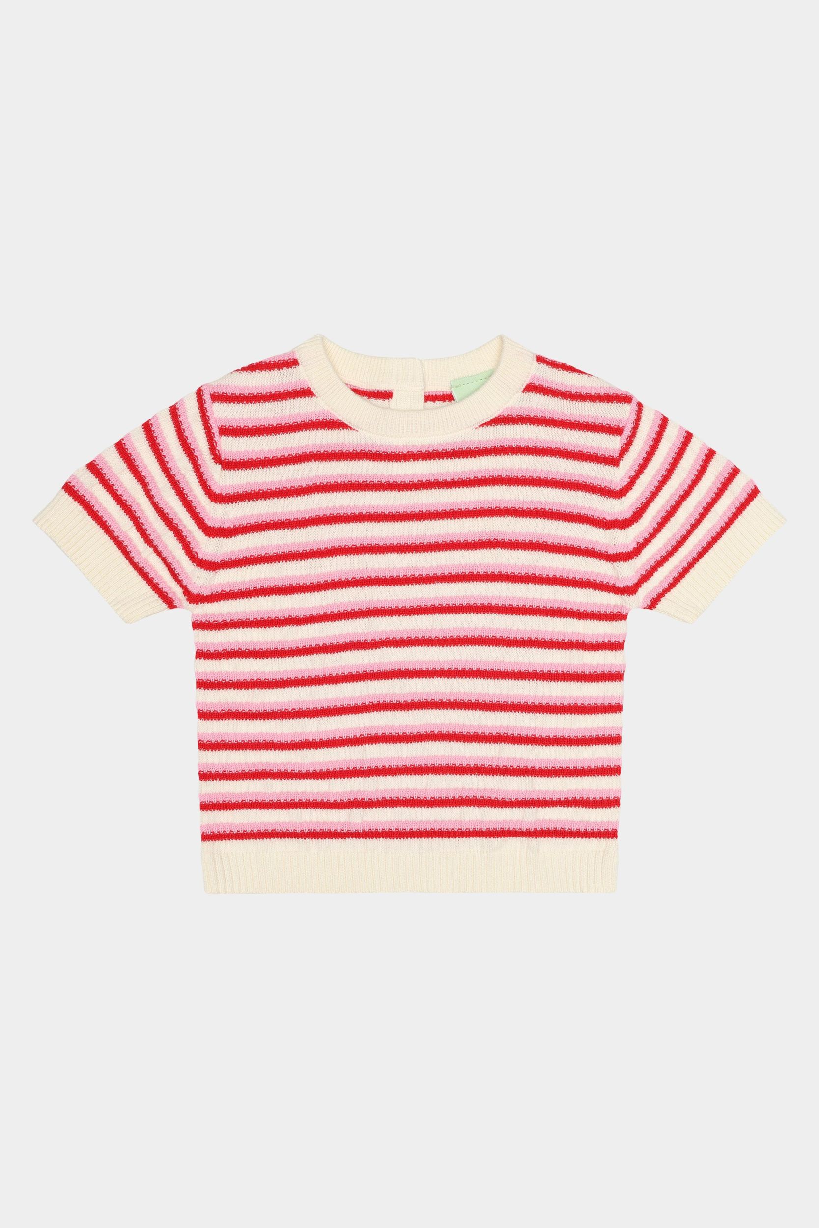 Denne kortærmede T-shirt er strikket i et tofarvet stribemønster og er designet med rund hals og praktisk knaplukning på skulderen med perlemorsknapper. Den har en almindelig pasform med ribstrikkede kanter og er lavet af økologisk bomuld.