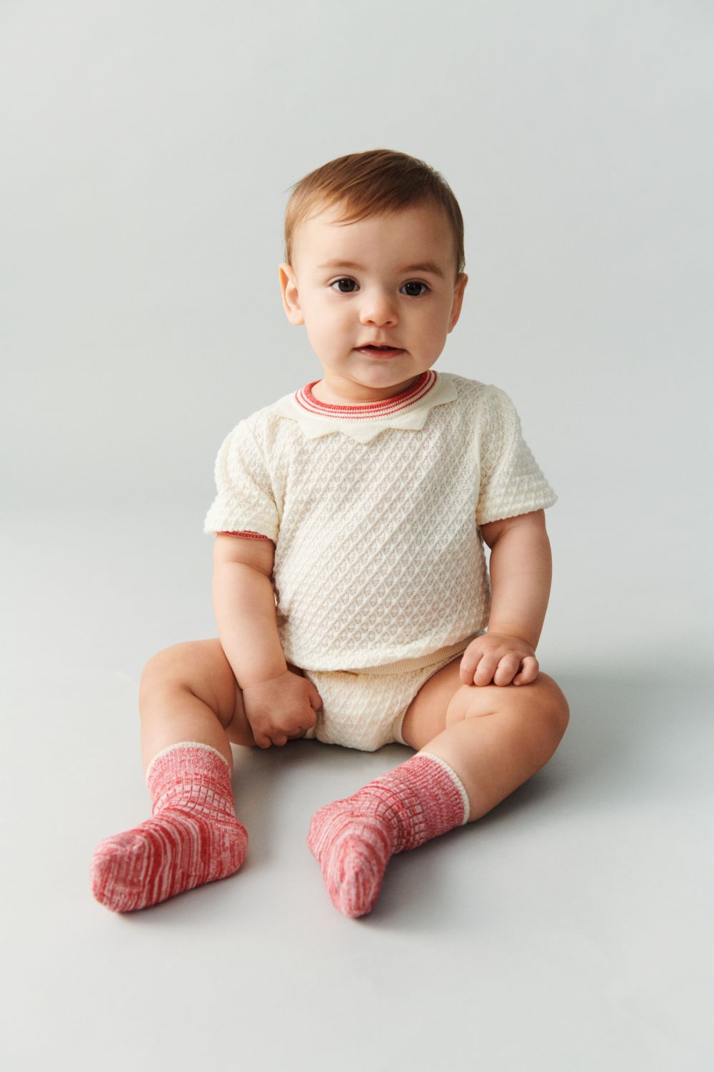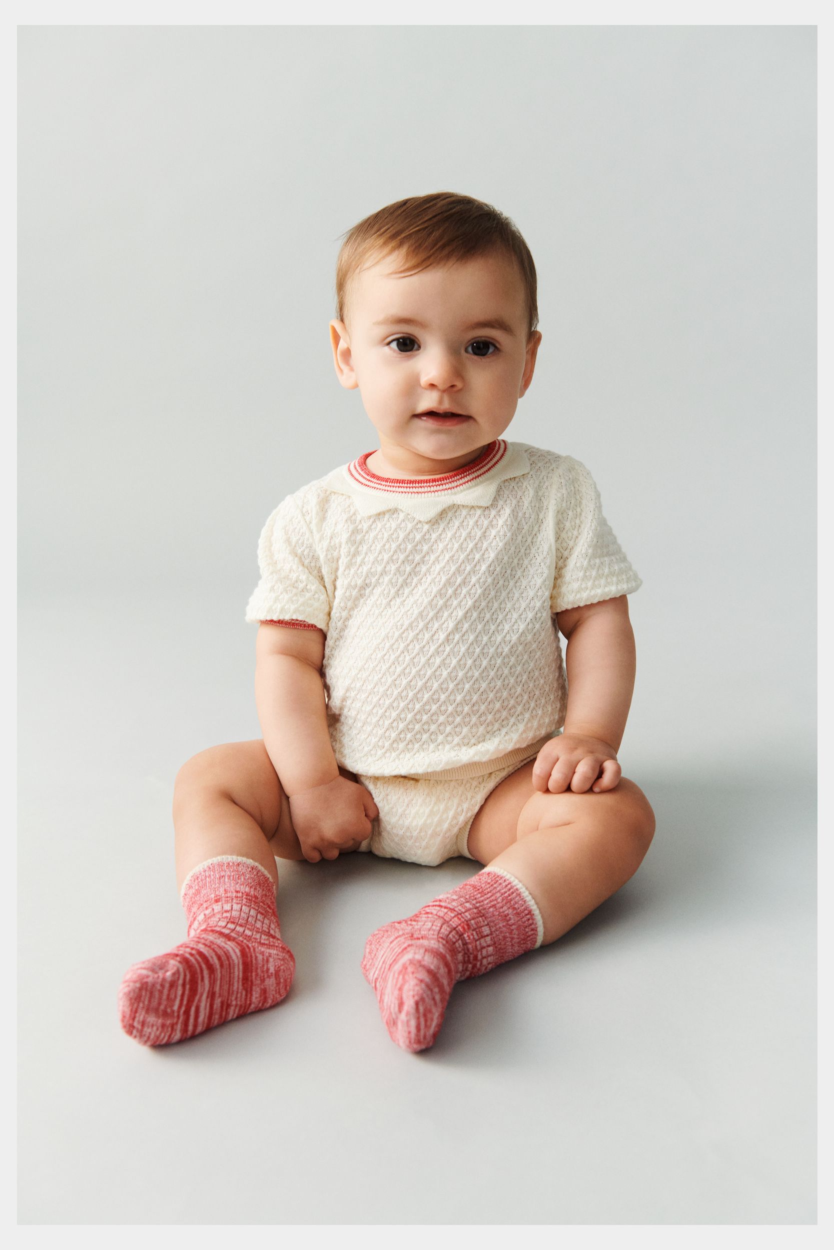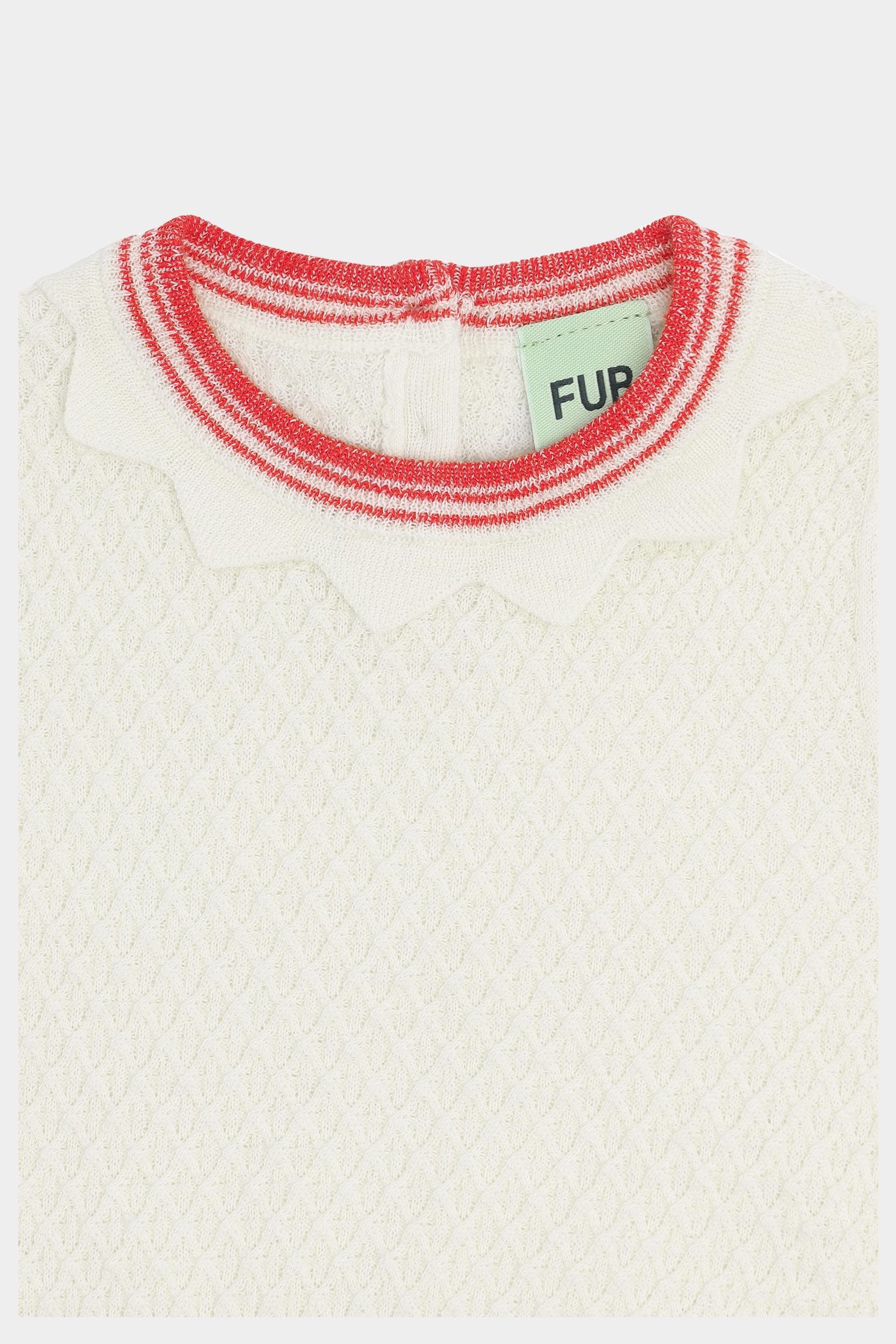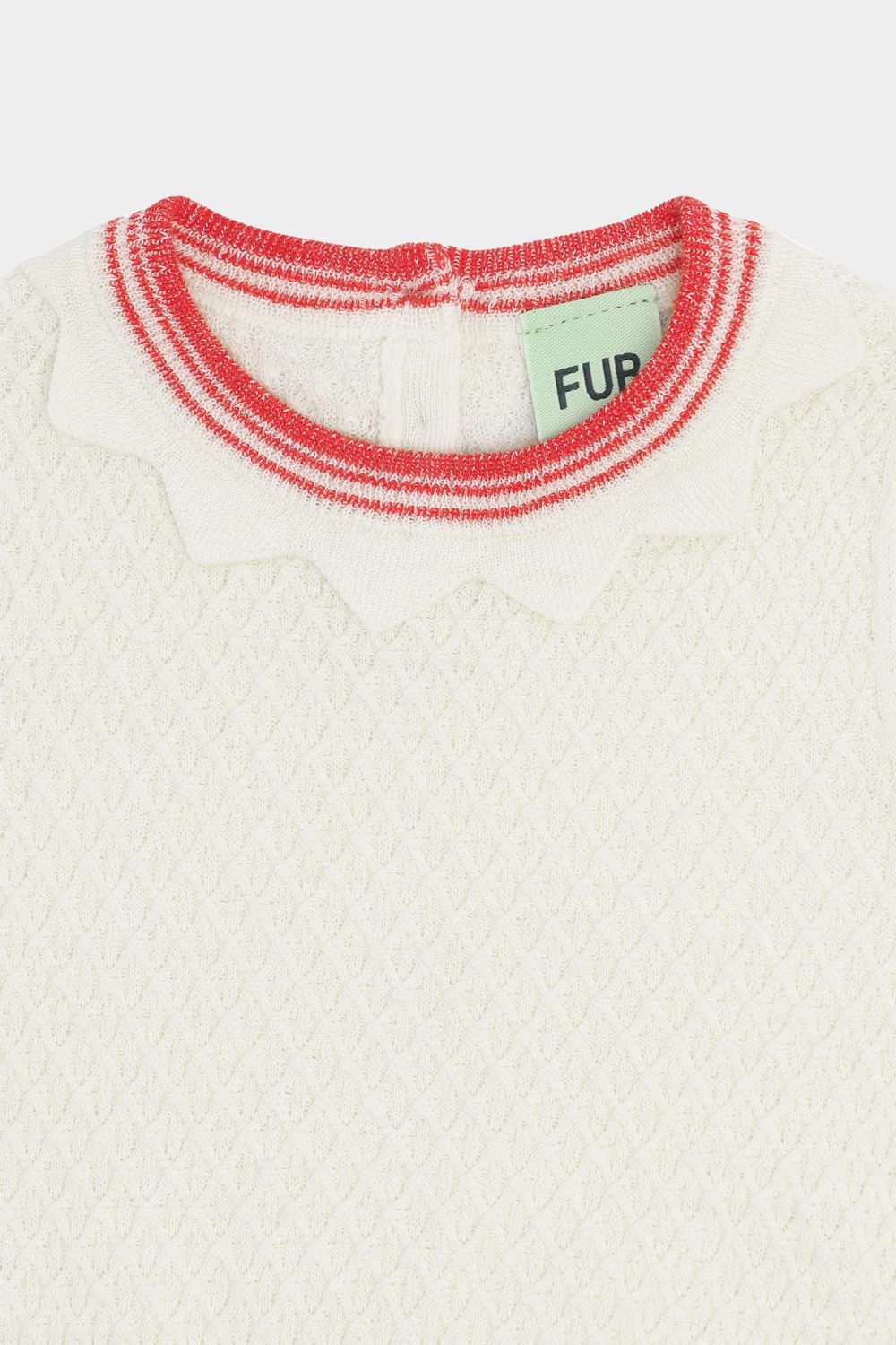 Denne kortærmede t-shirt er strikket i et vaflet strukturmønster. Den har korte pufærmer, en smal stribet halskant med strikket blondedetalje og dekorative stribede ribkanter. T-shirten er designet med en praktisk knaplukning på ryggen med perlemorsknapper, den har en almindelig pasform og er lavet af økologisk bomuld.