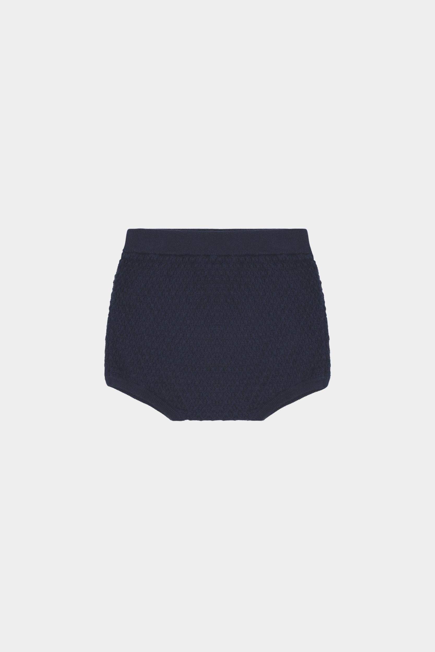 Disse babyshorts er strikket i et vaflet strukturmønster og har elastikkant i taljen, som sikrer en komfortabel pasform. Shortsene har en afslappet pasform med ribstrikkede kanter og er lavet af økologisk bomuld.