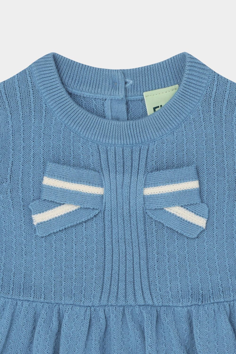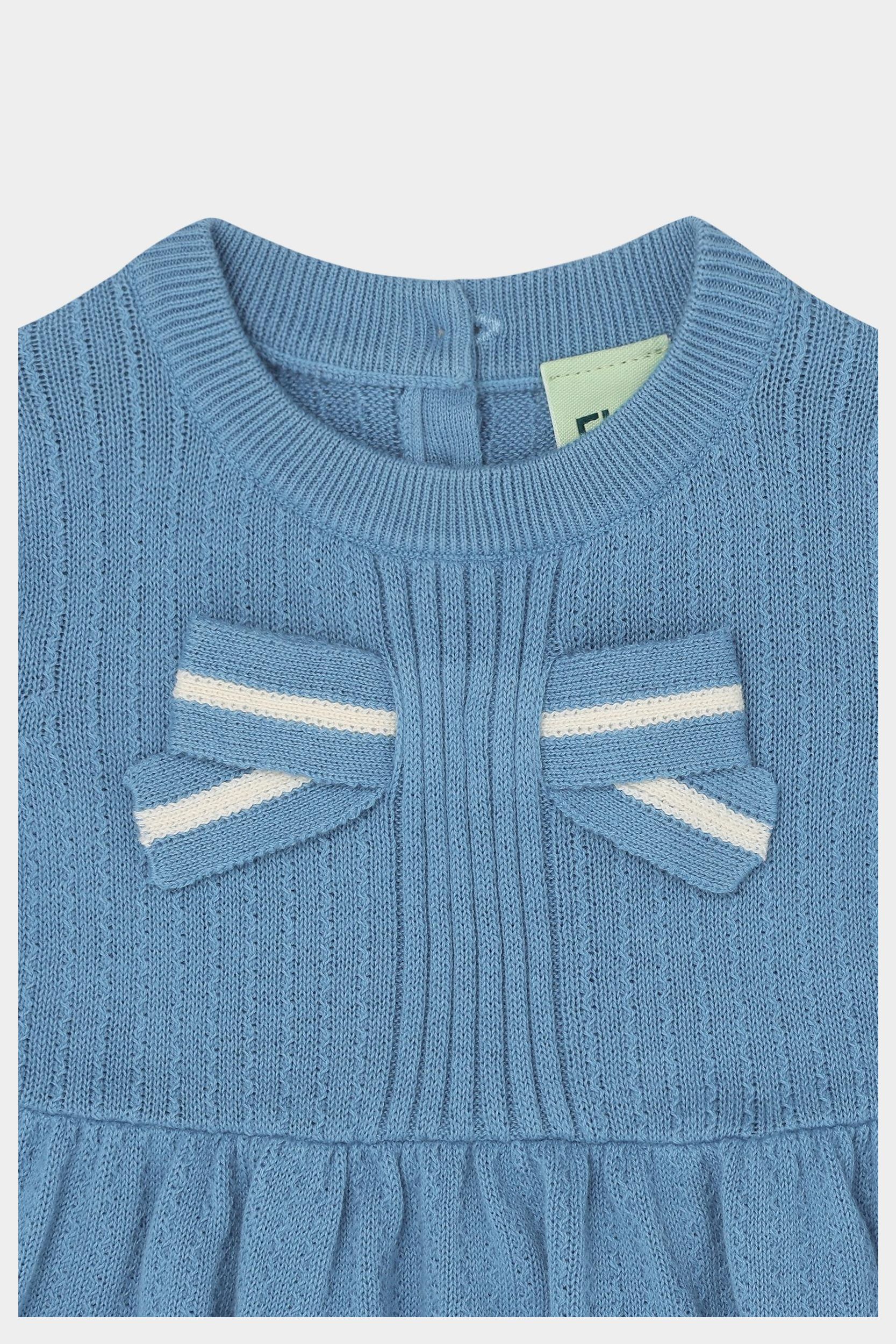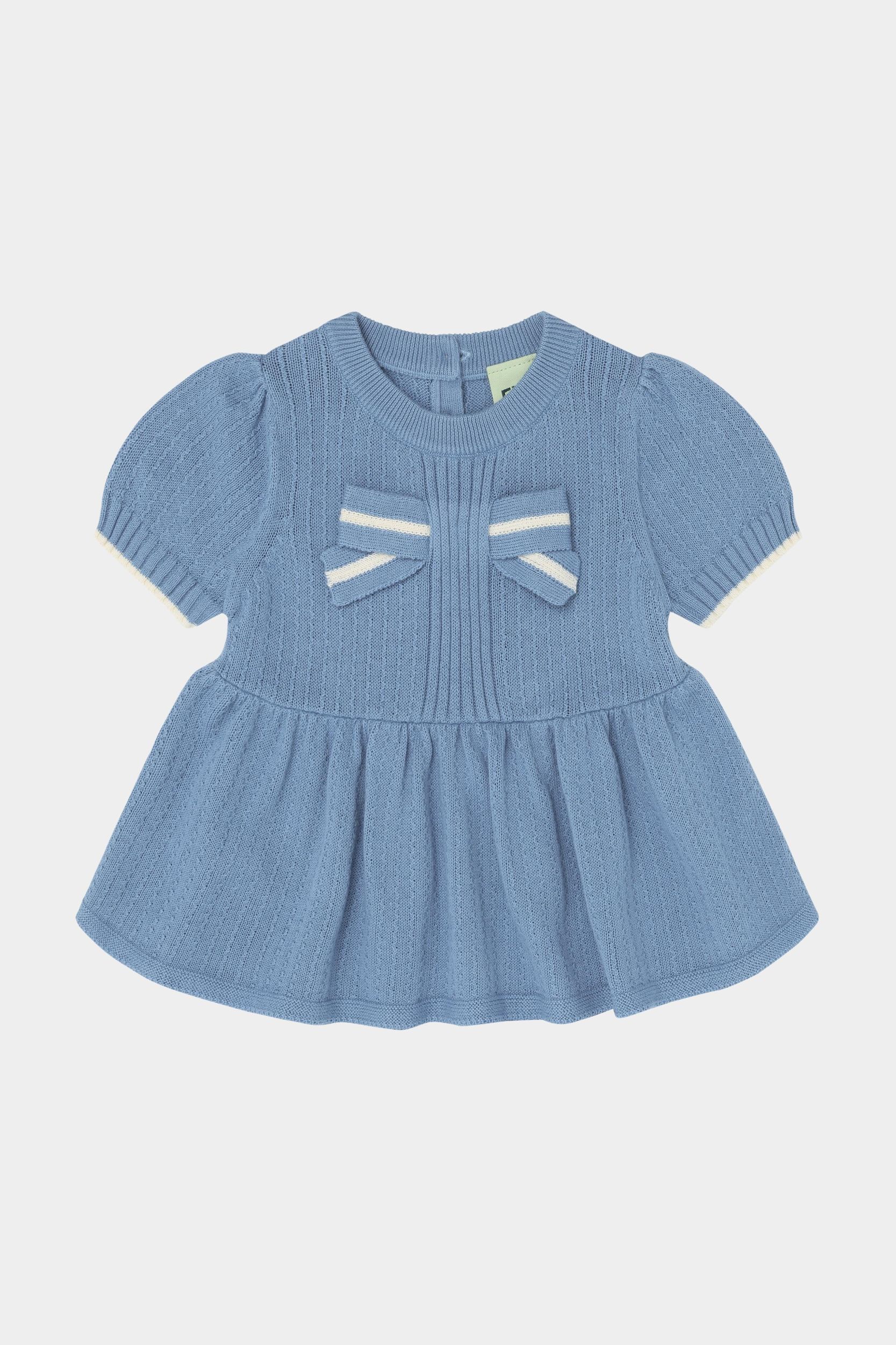 Denne kortærmede top er strikket i en dekorativ struktur har små bløde læg i taljen, der giver volumen til den nederste del af blusen. Den har en stor stribet sløjfe foran og er designet med pufærmer, ribstrikket halskant og kontrastfarvet strib på ærmekanterne. Toppen har en praktisk knaplukning på ryggen med perlemorsknapper og er lavet af økologisk bomuld.