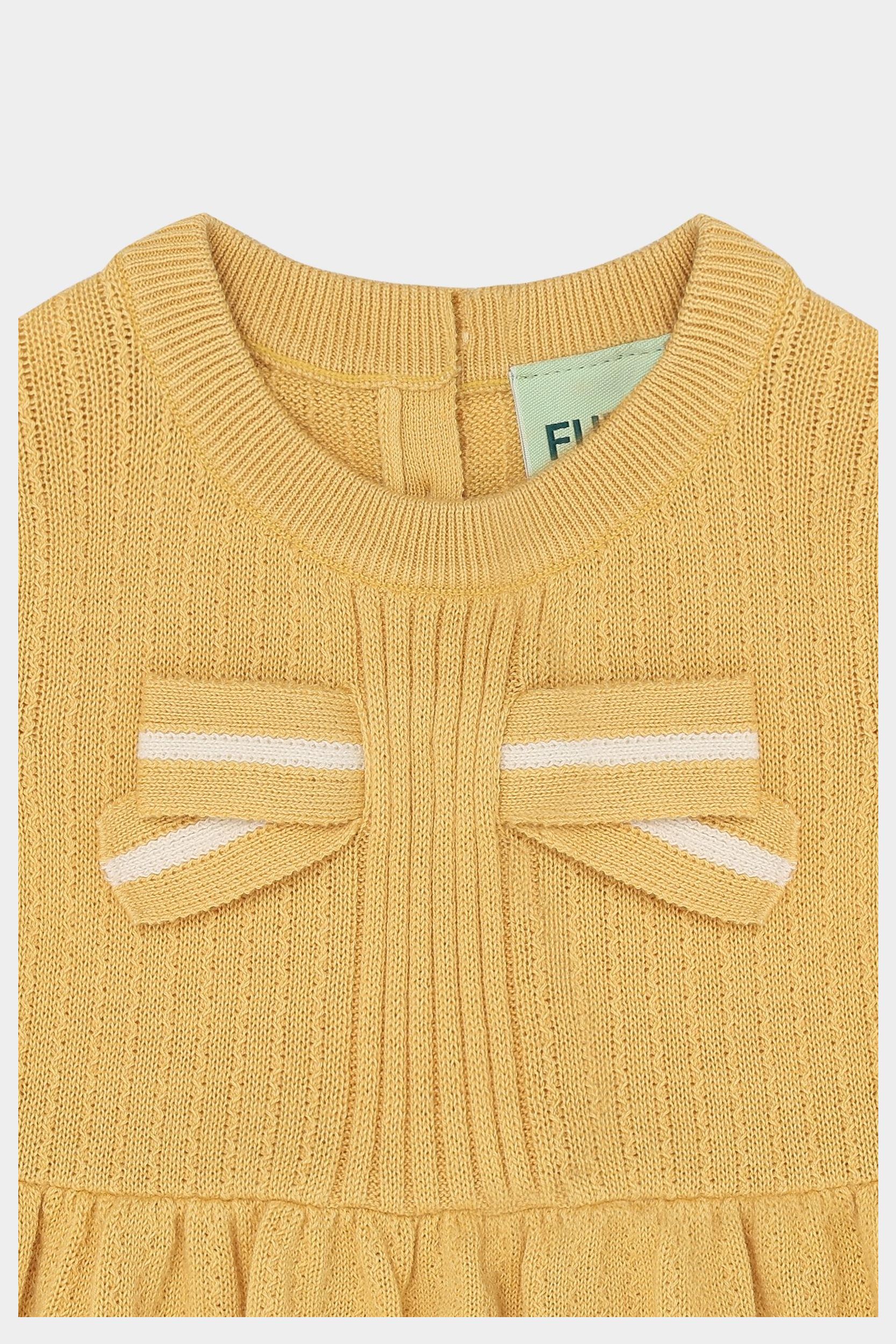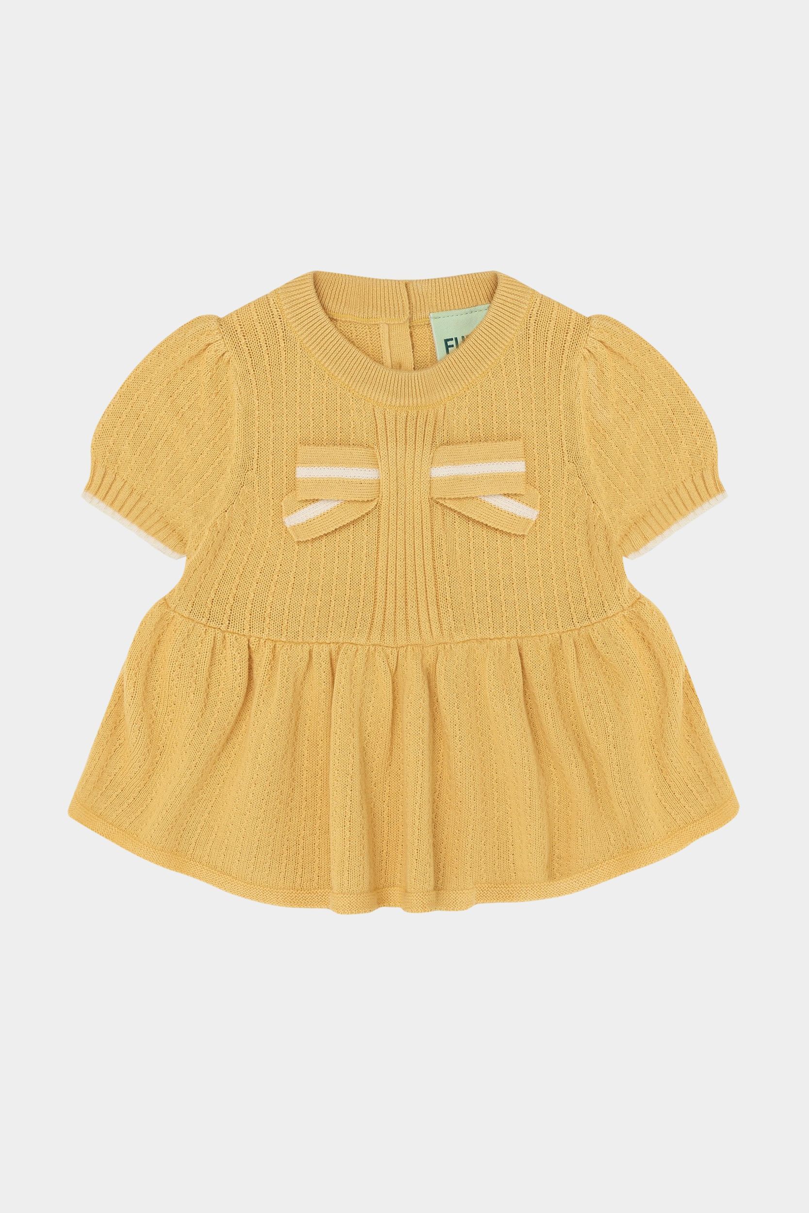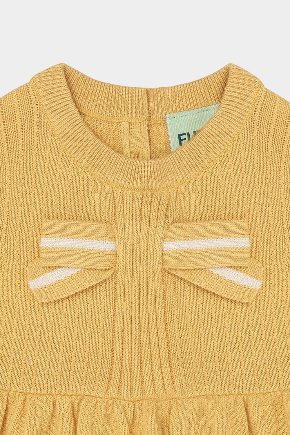Denne kortærmede top er strikket i en dekorativ struktur har små bløde læg i taljen, der giver volumen til den nederste del af blusen. Den har en stor stribet sløjfe foran og er designet med pufærmer, ribstrikket halskant og kontrastfarvet strib på ærmekanterne. Toppen har en praktisk knaplukning på ryggen med perlemorsknapper og er lavet af økologisk bomuld.