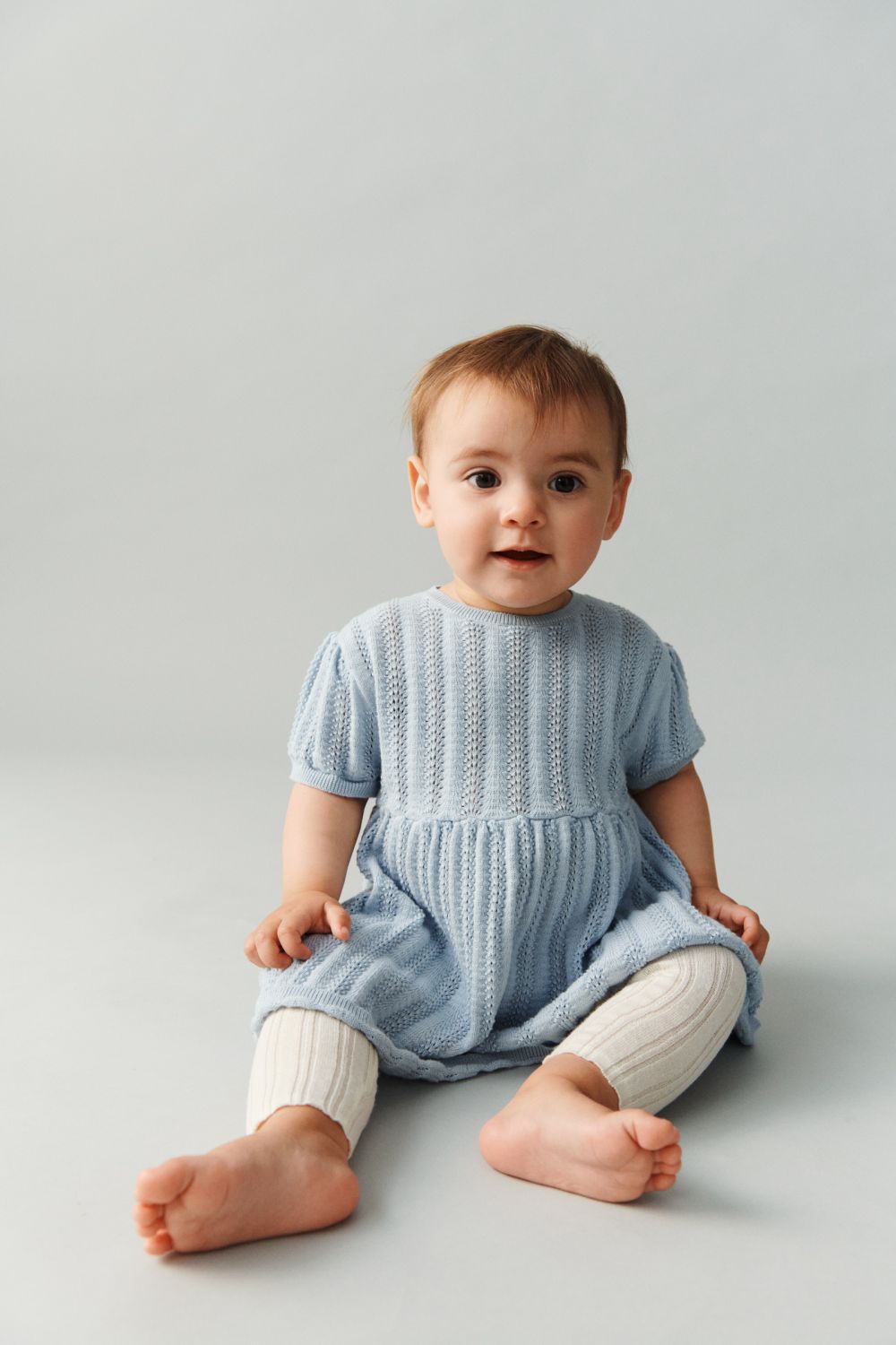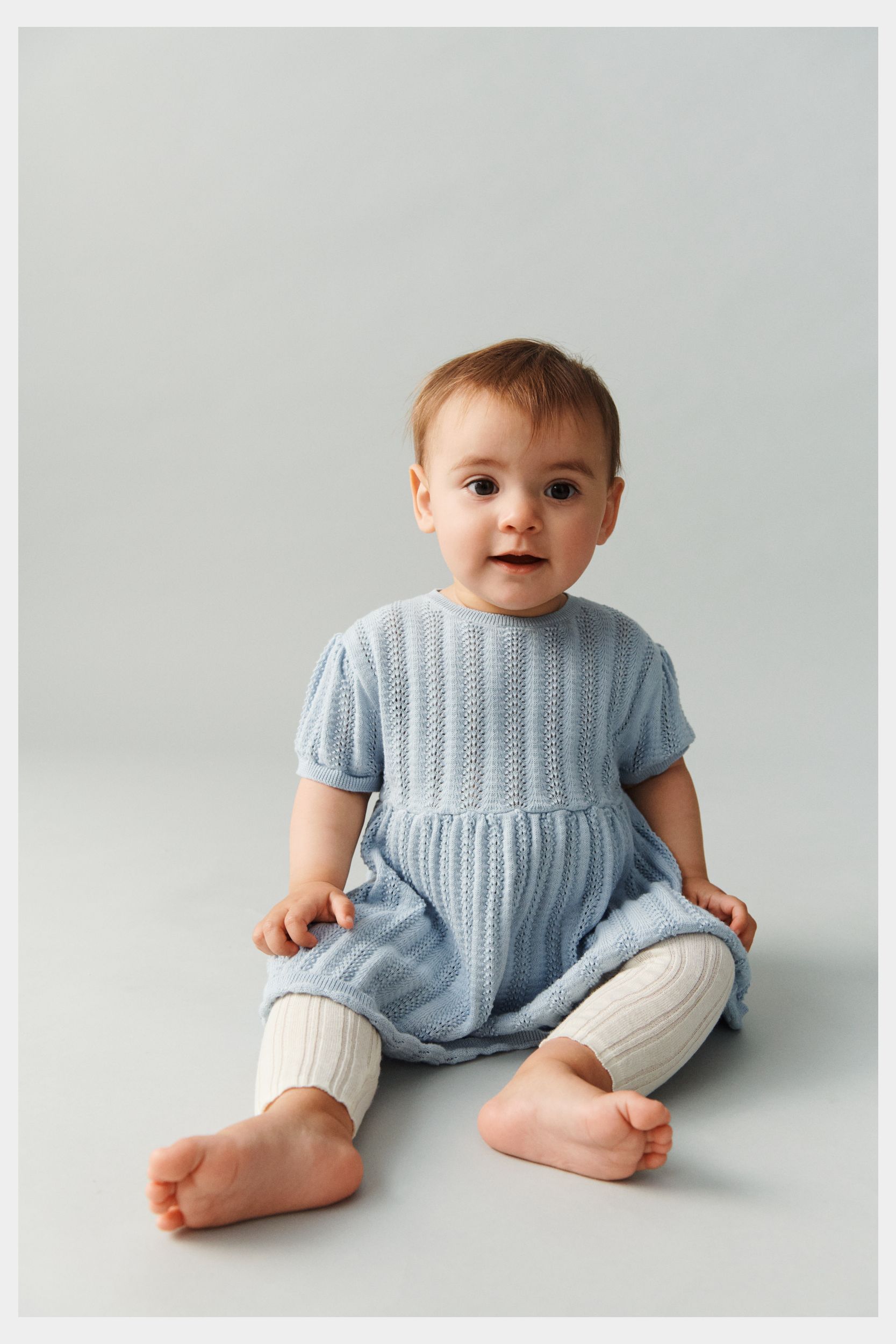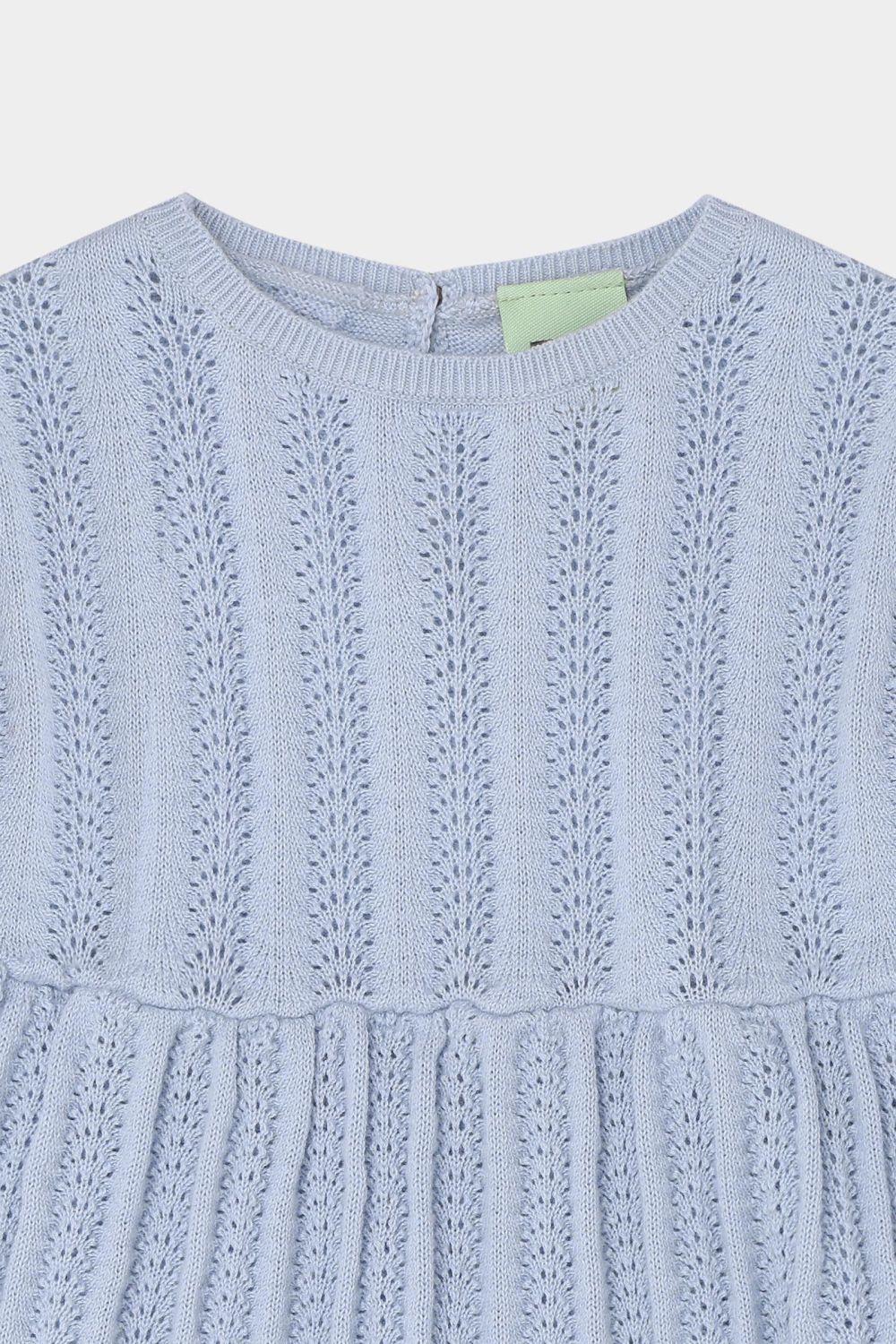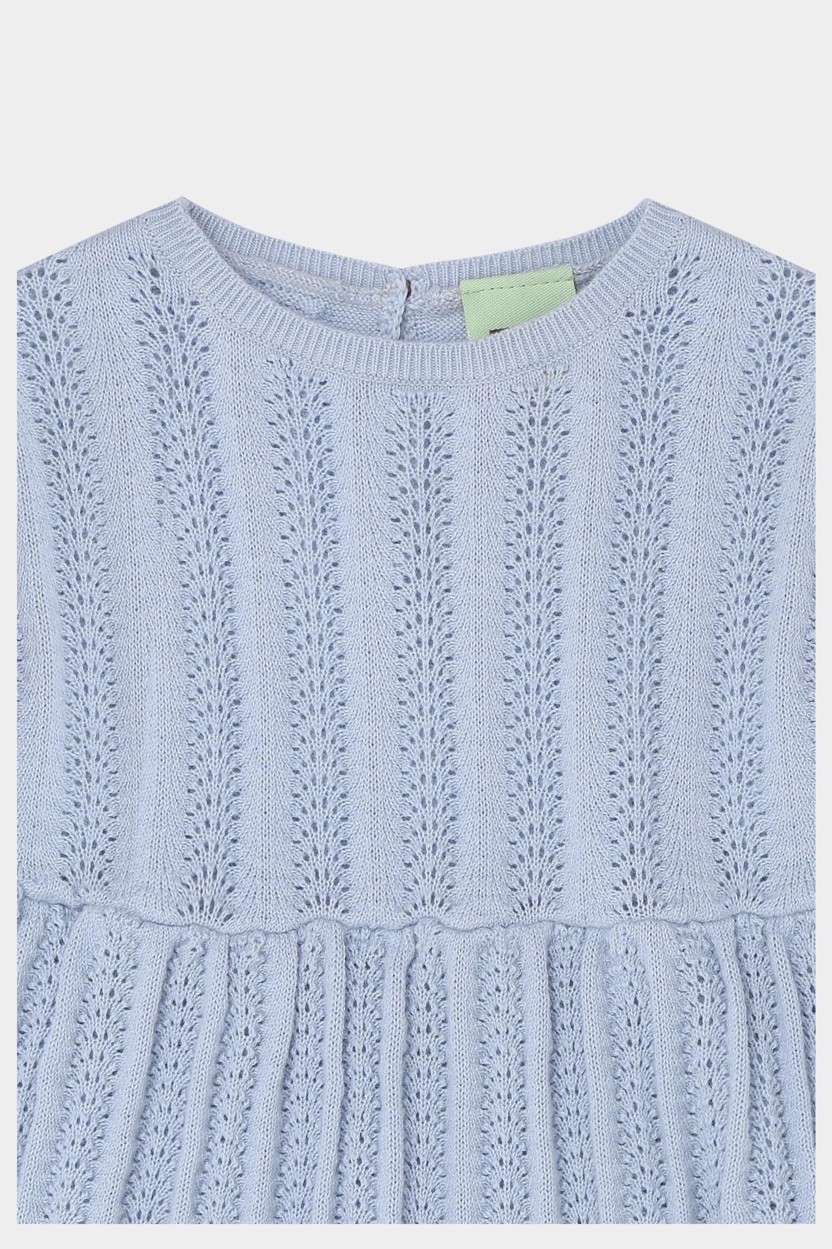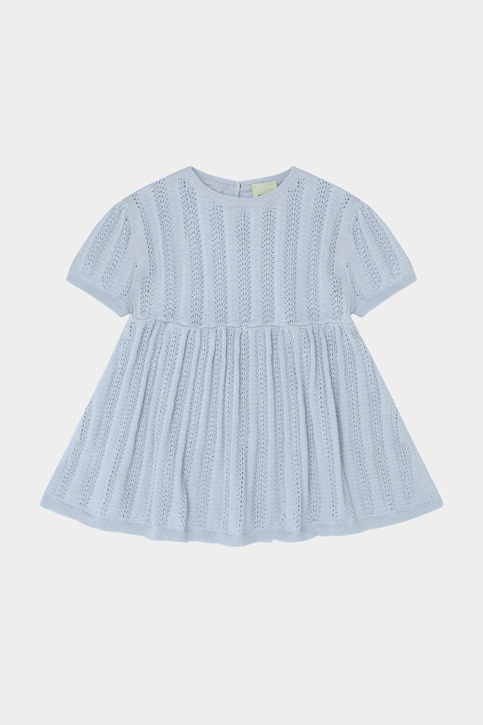 Denne kortærmede babykjole er strikket i en dekorativ pointellestruktur med smalle ribkanter og små bløde læg i taljen, der giver skørtet volumen. Kjolen har rund hals og en praktisk knaplukning på ryggen med perlemorsknapper og er lavet af økologisk bomuld.