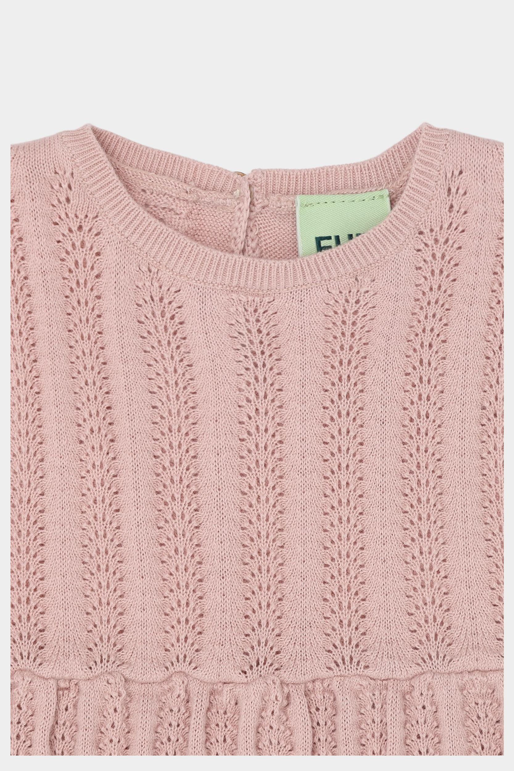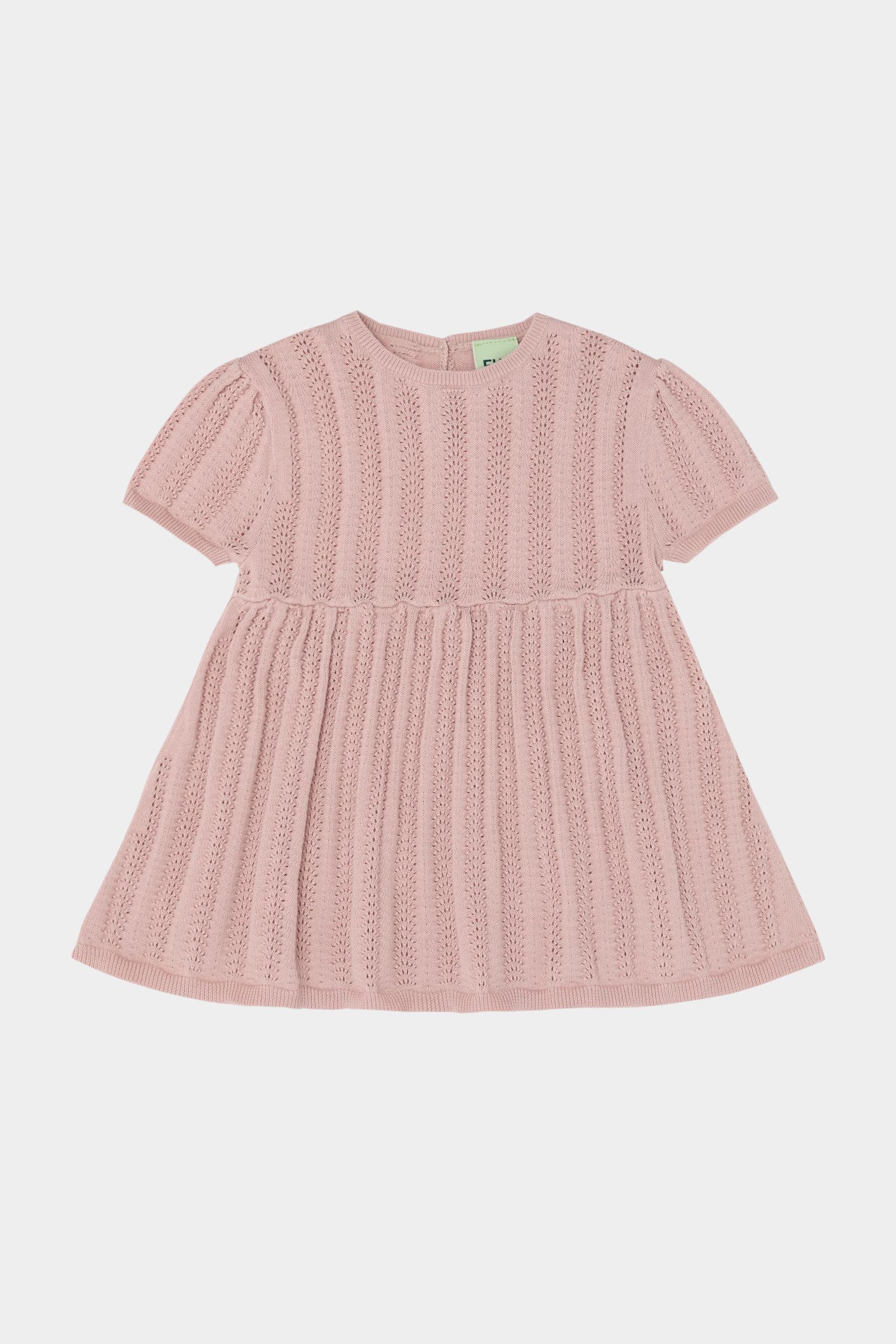 Denne kortærmede babykjole er strikket i en dekorativ pointellestruktur med smalle ribkanter og små bløde læg i taljen, der giver skørtet volumen. Kjolen har rund hals og en praktisk knaplukning på ryggen med perlemorsknapper og er lavet af økologisk bomuld.