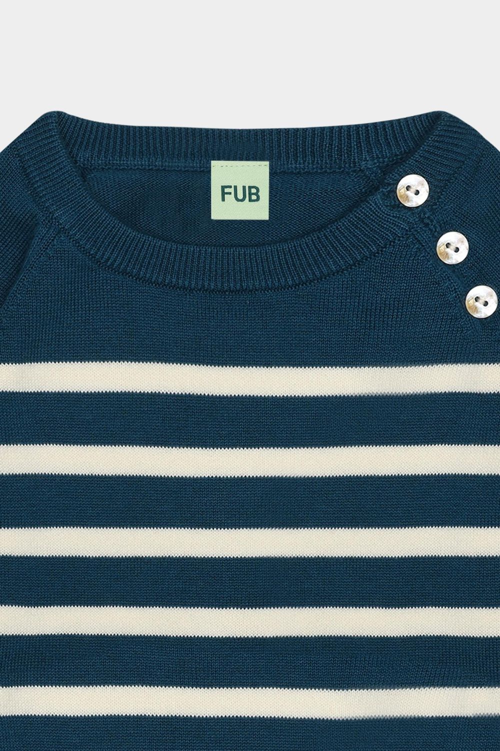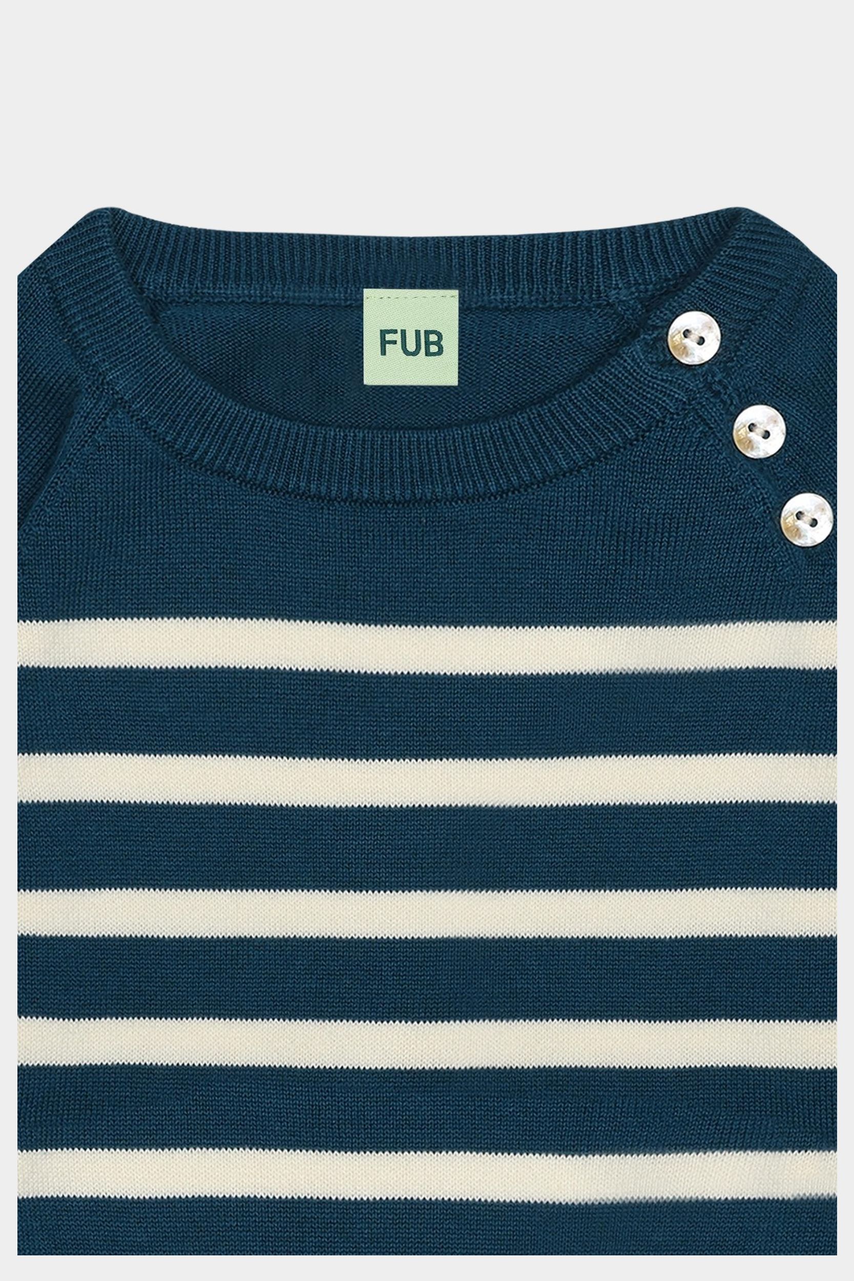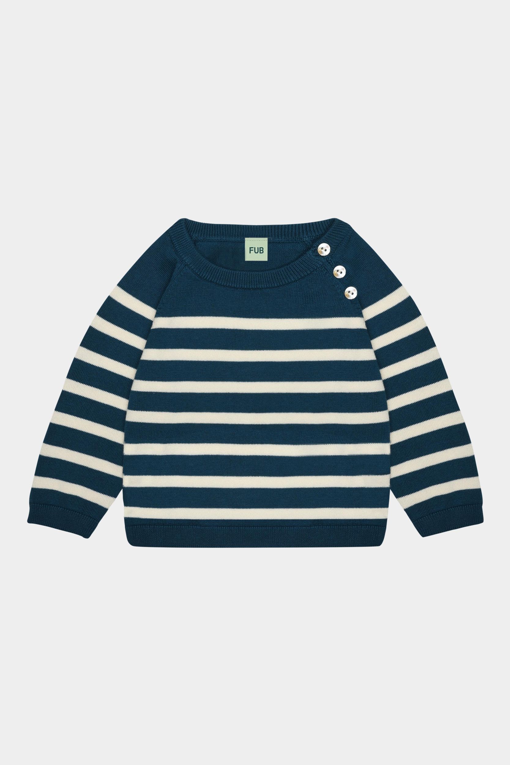 Denne langærmede babybluse er strikket i fast single jersey med klassiske striber. Den har en let løs pasform og er designet med raglanærmer og ribkanter. Blusen har en praktisk knaplukning på skulderen med perlemorsknapper og er lavet af økologisk bomuld.