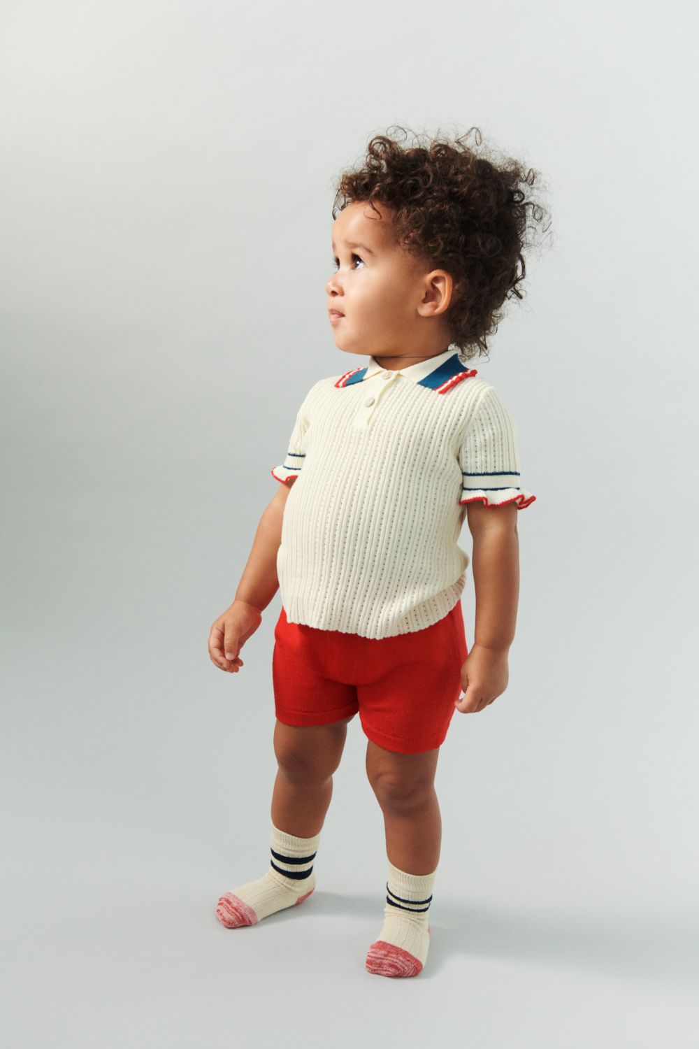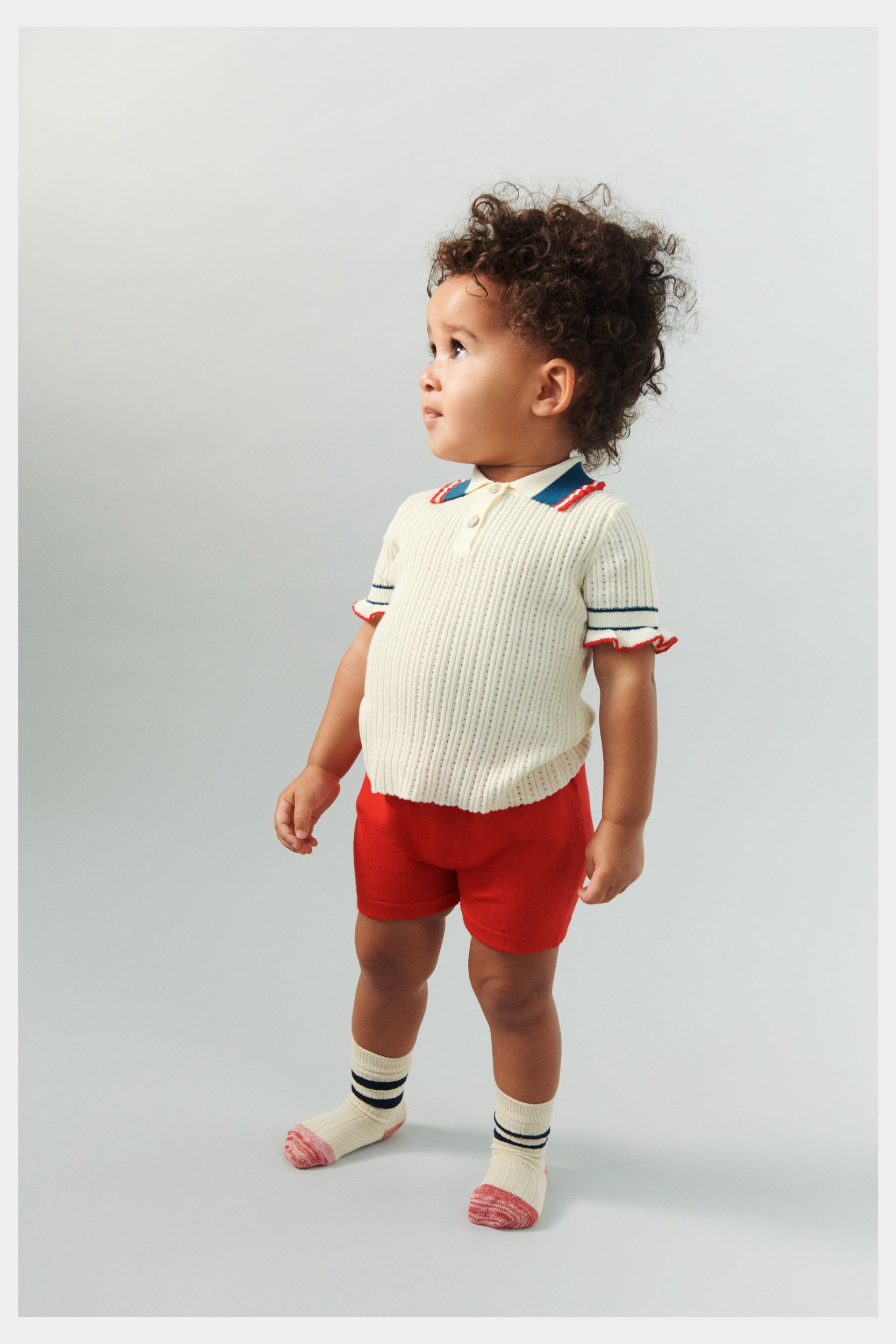 Disse babyshorts er strikket i let single jersey og har elastikkant i taljen, som sikrer en komfortabel pasform. De er bløde og behagelige og har en afslappet pasform med lige ben og ombukkede kanter. Shortsene er lavet af økologisk bomuld.