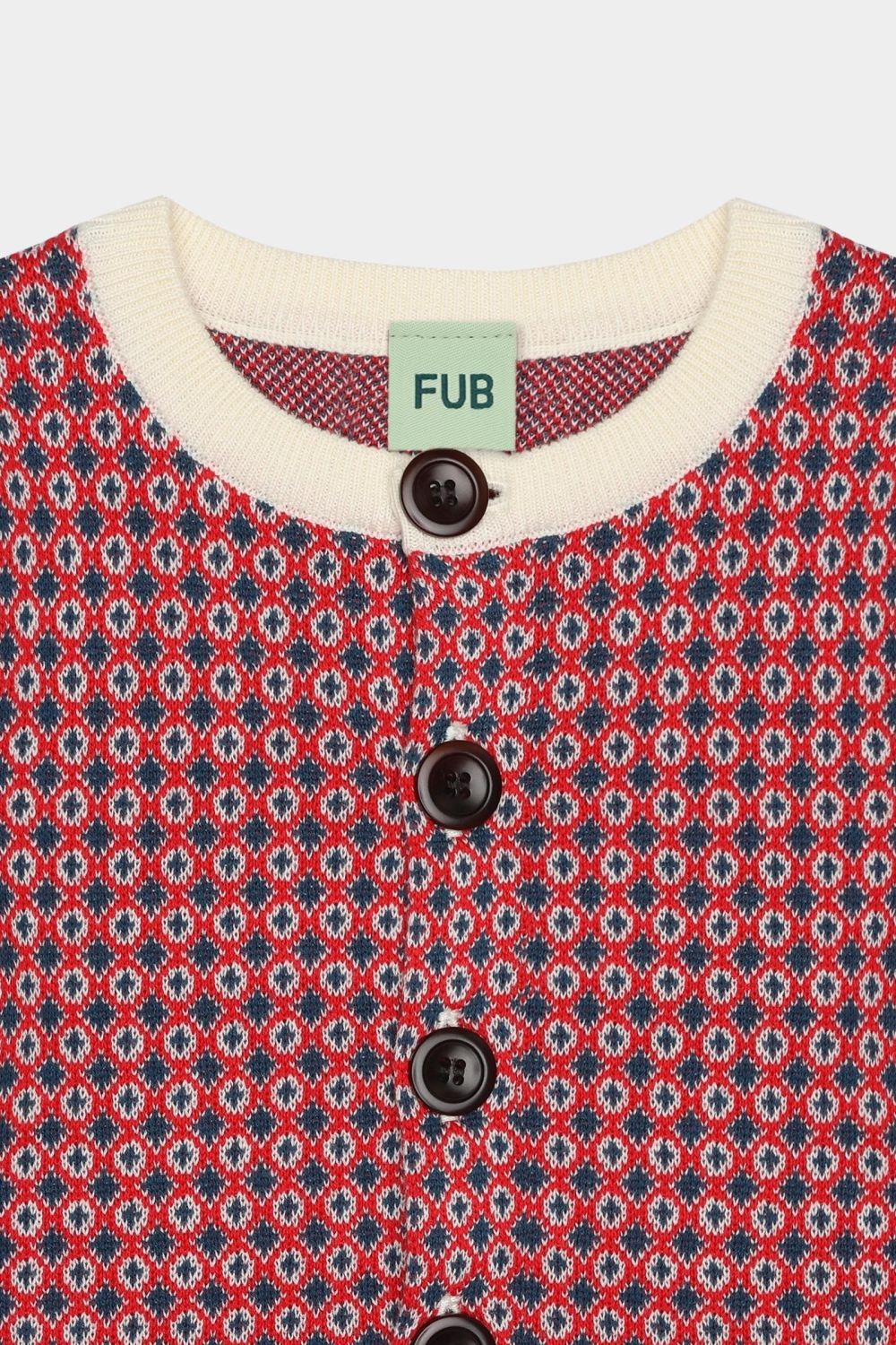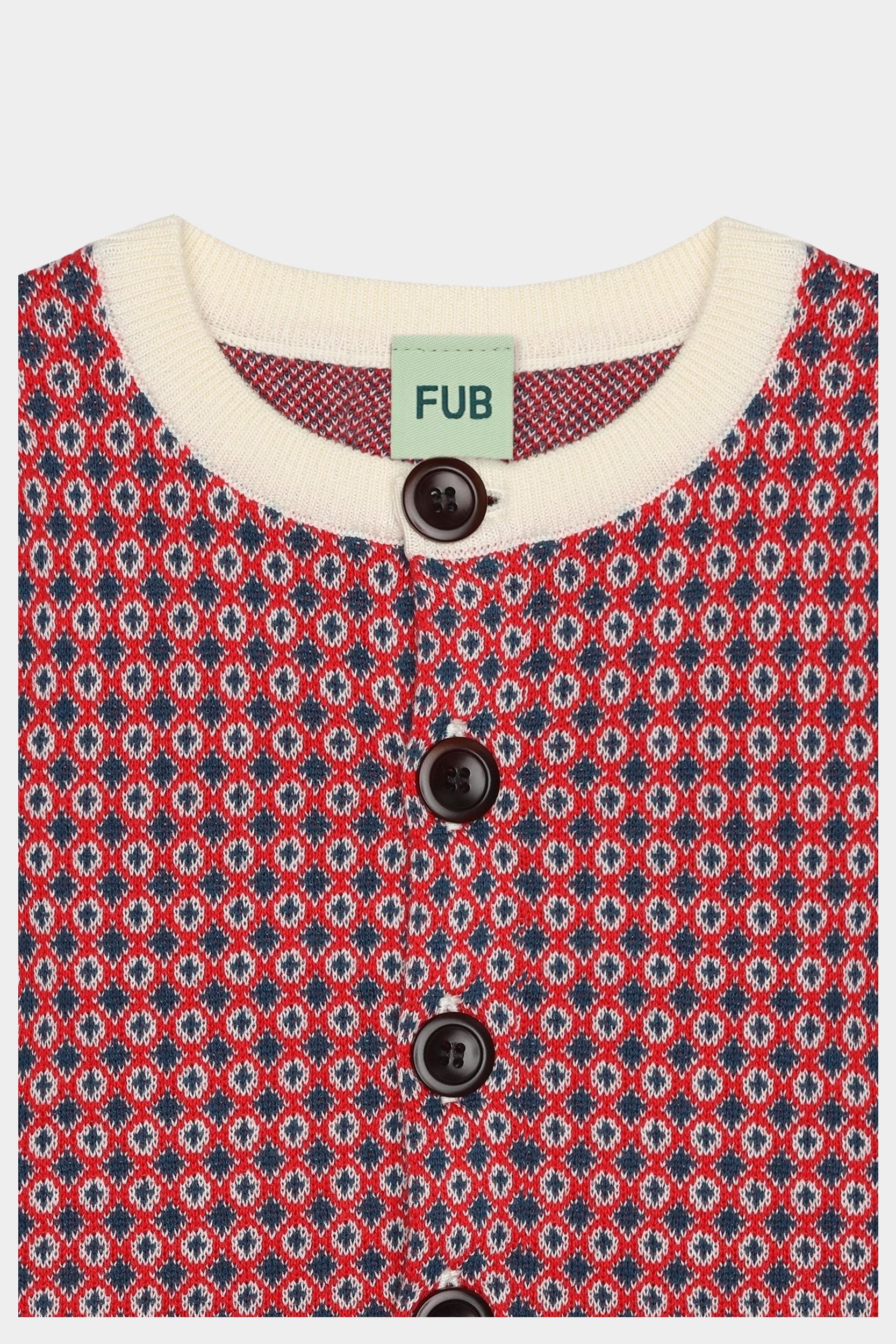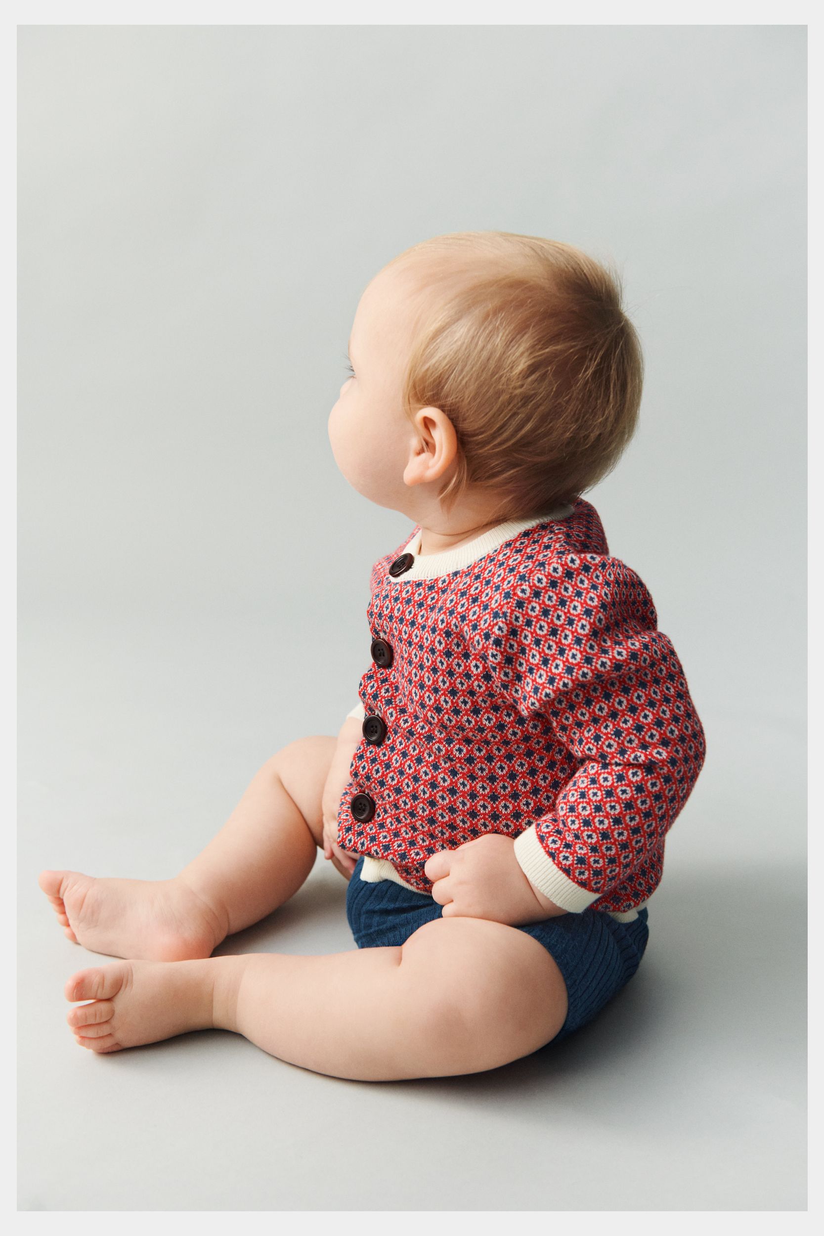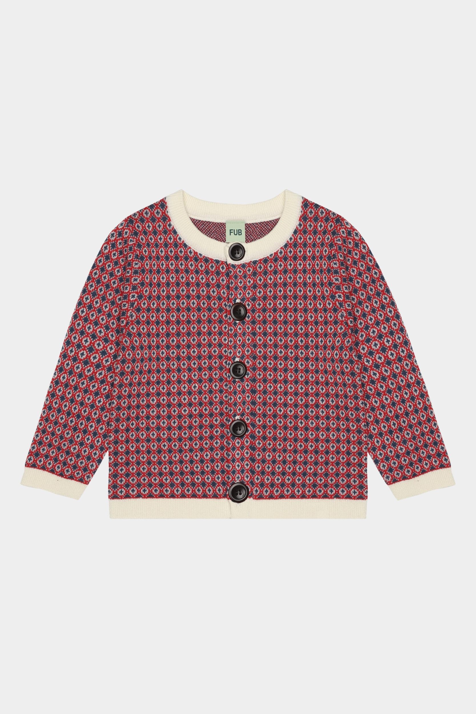 Denne babycardigan er strikket i et grafisk jacquardmønster. Den har rund ribstrikket hals, en rummelig pasform og lukkes foran med knapper af corozonød. Cardiganen fås i et blomstermønster og i et grafisk nordisk mønster og er lavet af økologisk bomuld.