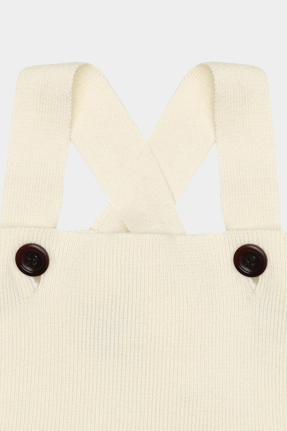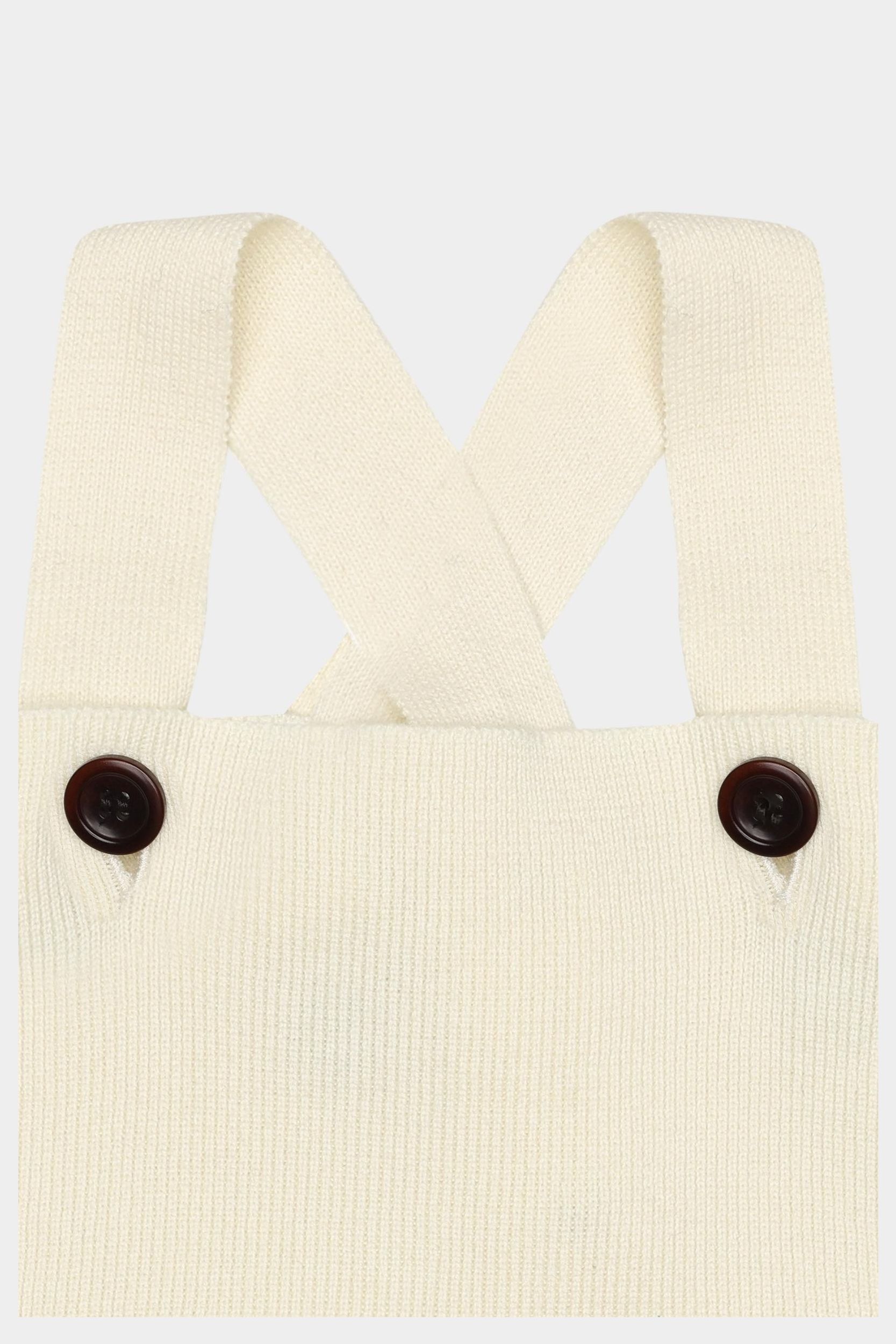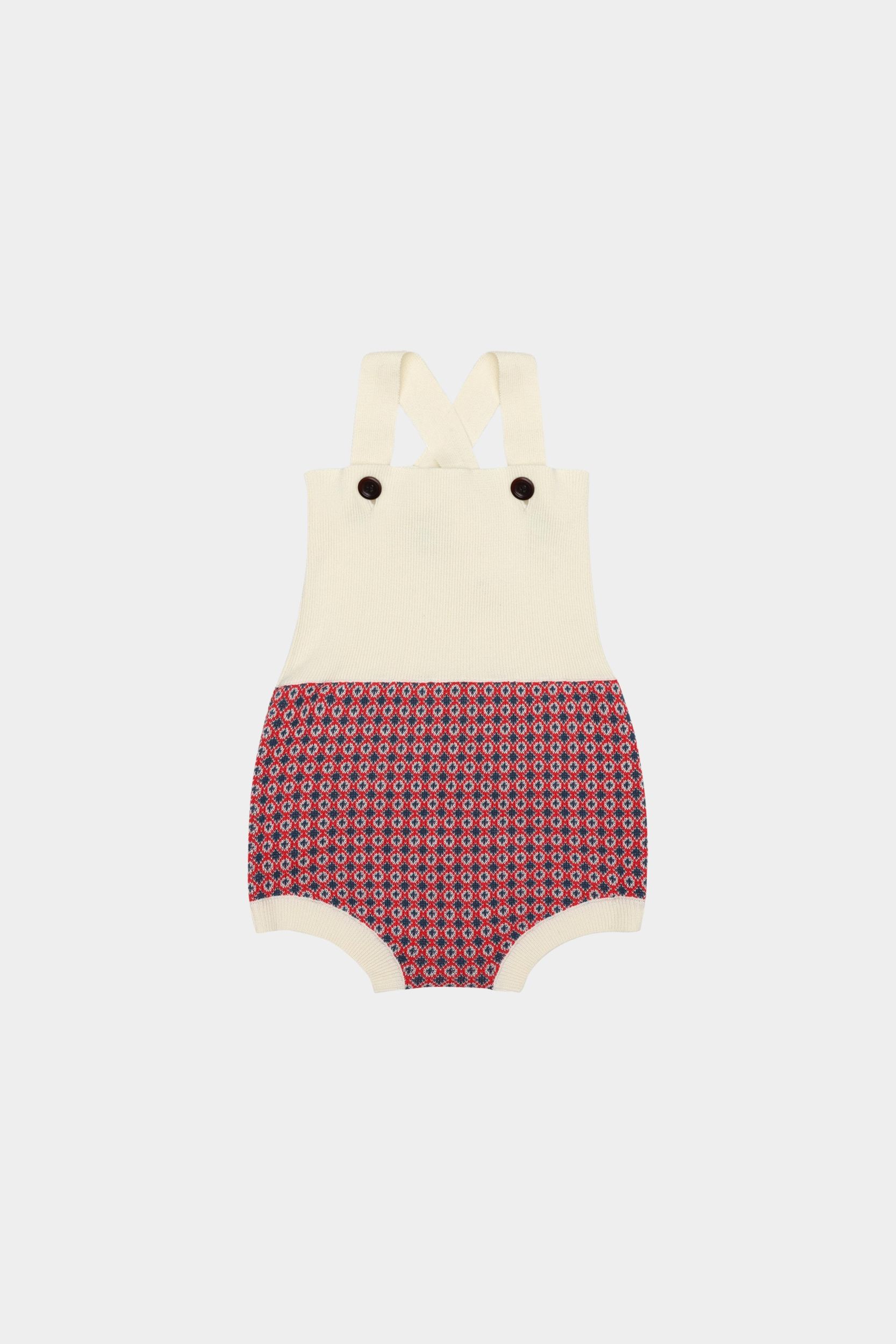 Denne babydragt er strikket i et grafisk jacquardmønster med et ribstrikket frontstykke, ribkanter og aftagelige seler, som knappes foran med knapper af corozonød. Selerne krydses på ryggen og kan justeres i to forskellige længder. Dragten fås i et blomstermønster og i et grafisk nordisk mønster og er lavet af økologisk bomuld.