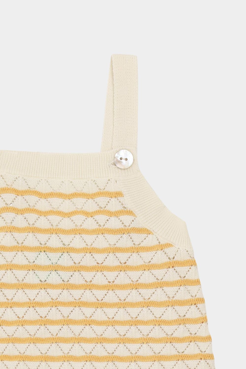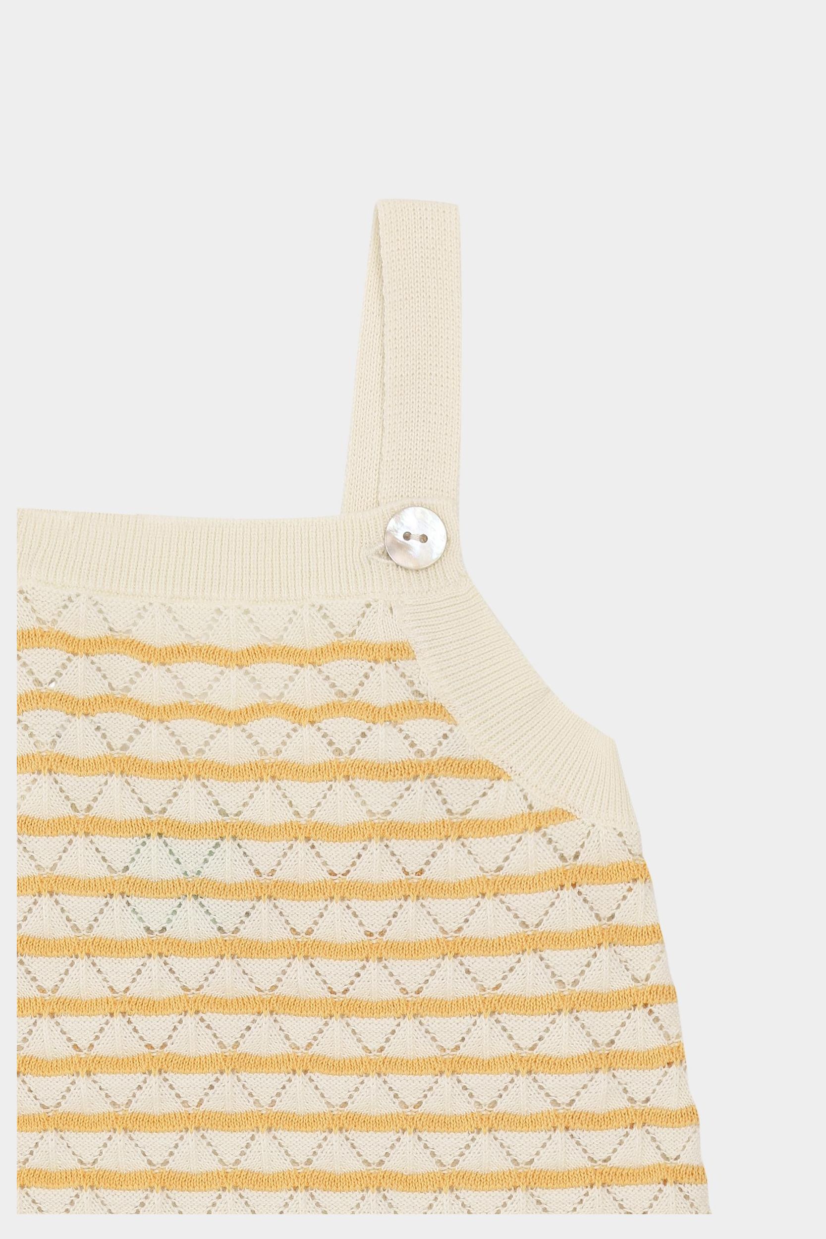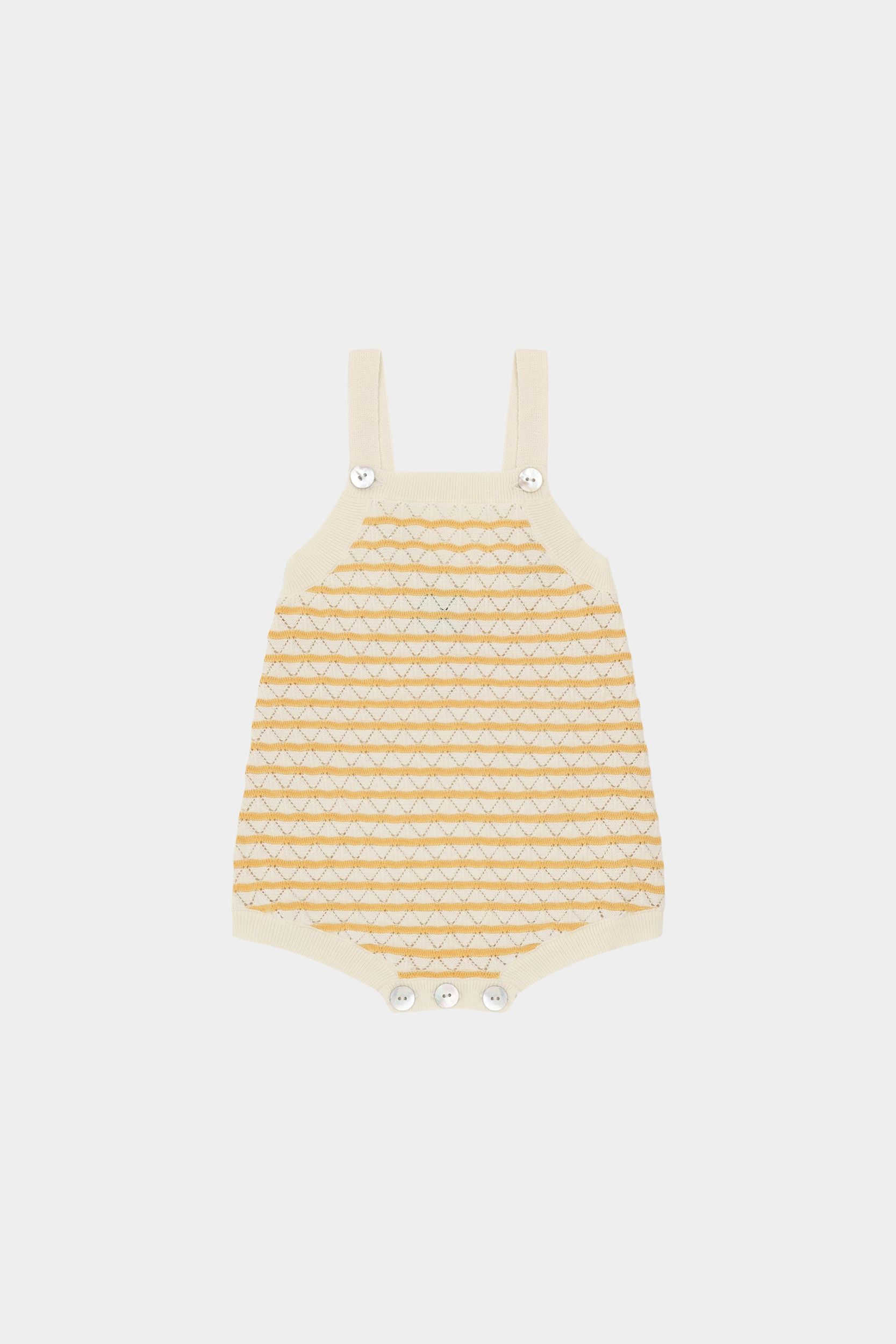 Denne babydragt er strikket i et pointelle mønster med kontrastfarvede striber. Dragten er designet med ribkanter og seler, der knappes foran med perlemorsknapper. Selerne krydser på ryggen og kan justeres i to længder. Dragten er lavet af økologisk bomuld.