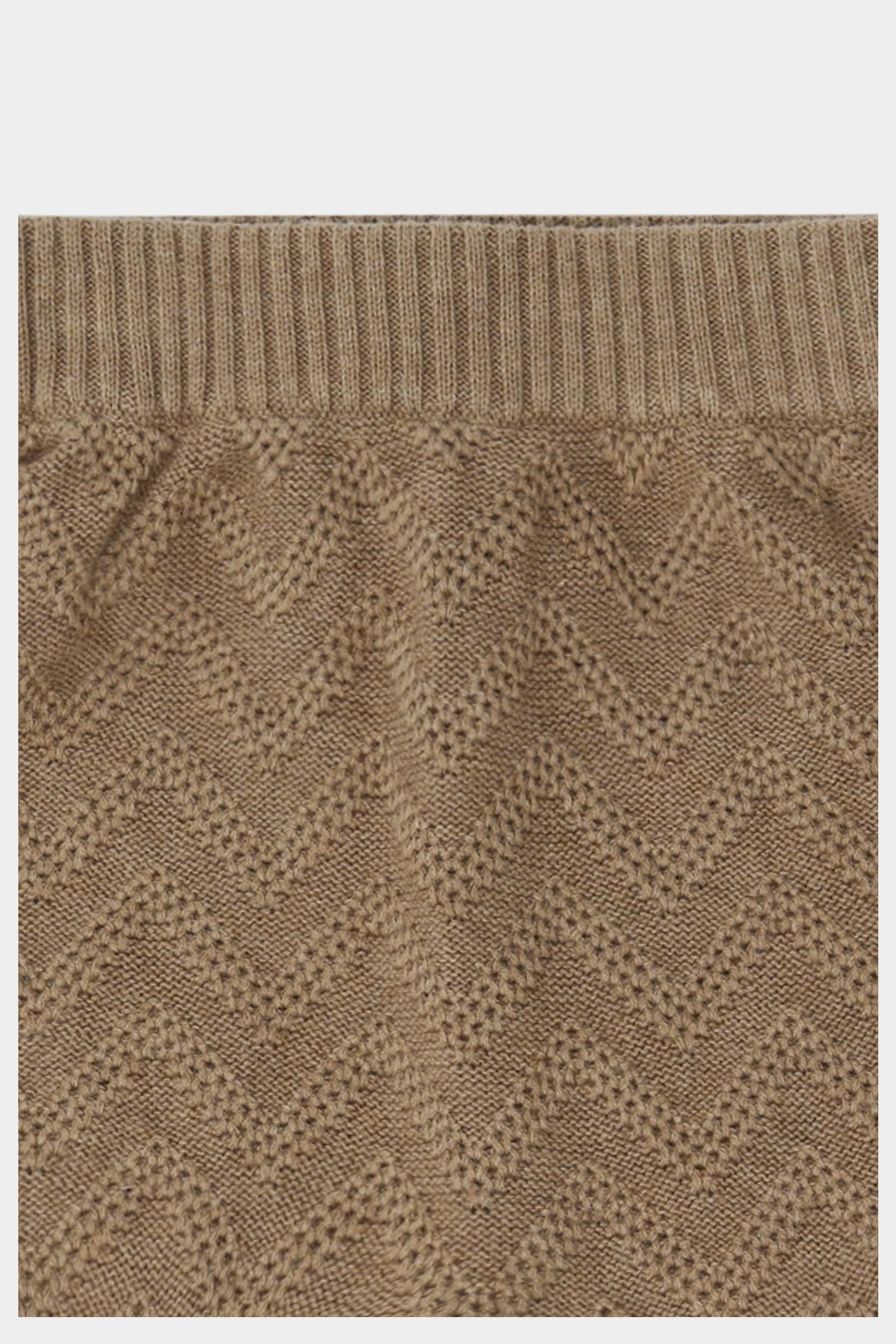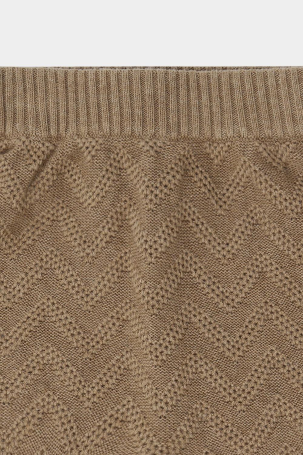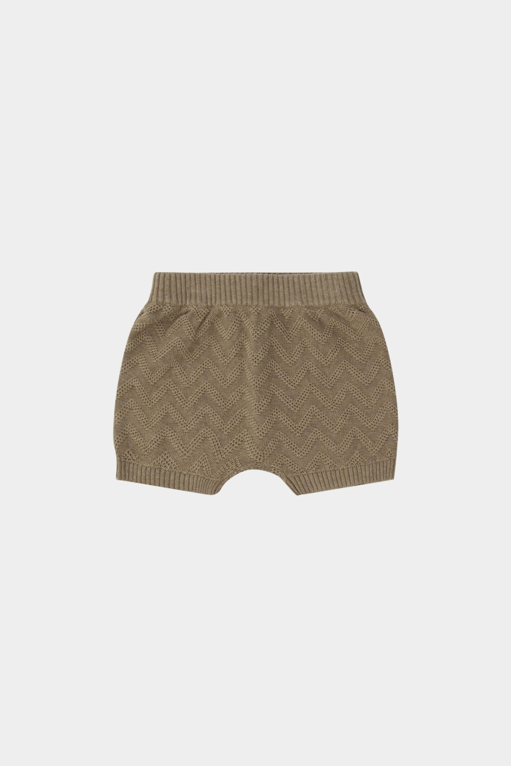 Disse babyshorts er strikket i en grafisk zigzag pointellestruktur og har elastikkant i taljen, som sikrer en komfortabel pasform. De er bløde og behagelige og har en afslappet pasform med lavt skridt og 2x2 ribkanter ved talje og benkant. Shortsene er lavet af økologisk bomuld.