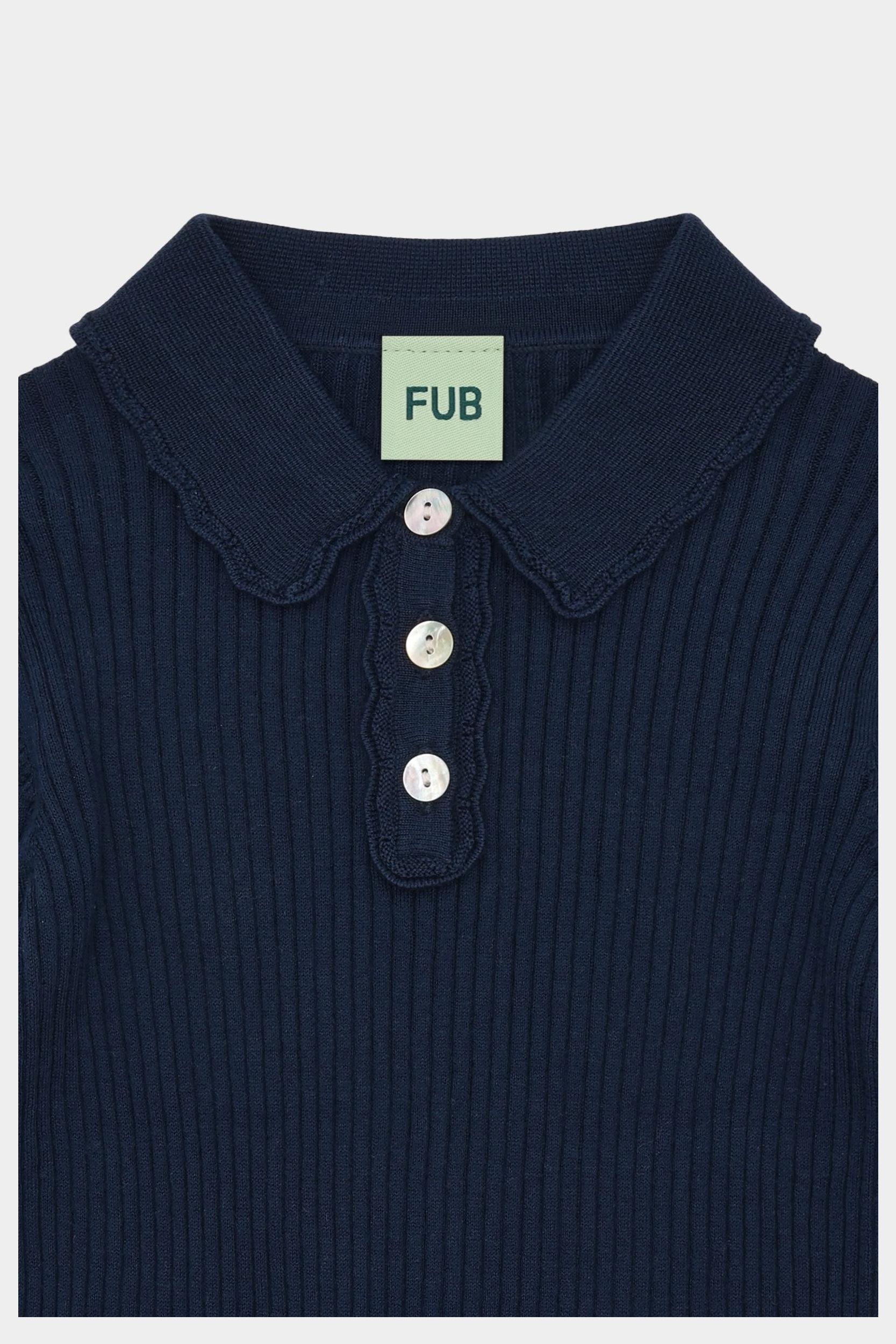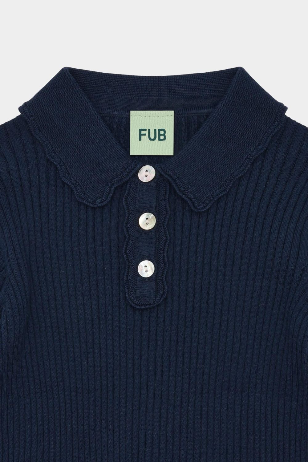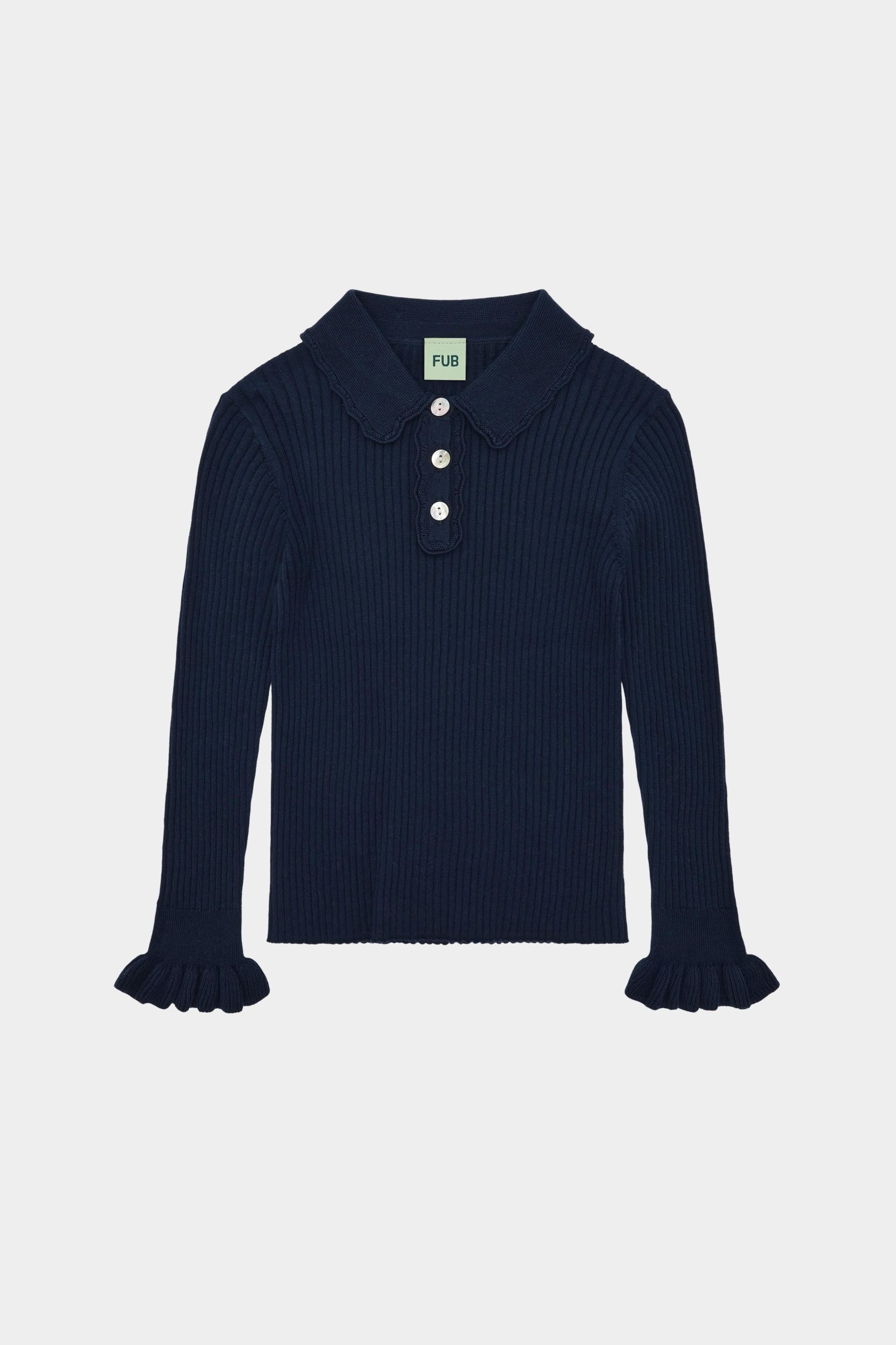 Denne langærmede polo er strikket i en klassisk ribstruktur. Den er designet med en lille krave med blondekant, strikkede flæsedetaljer på ærmekanterne og frontlukning med perlemorsknapper. Poloen har en lige, smal pasform og er lavet af økologisk bomuld.