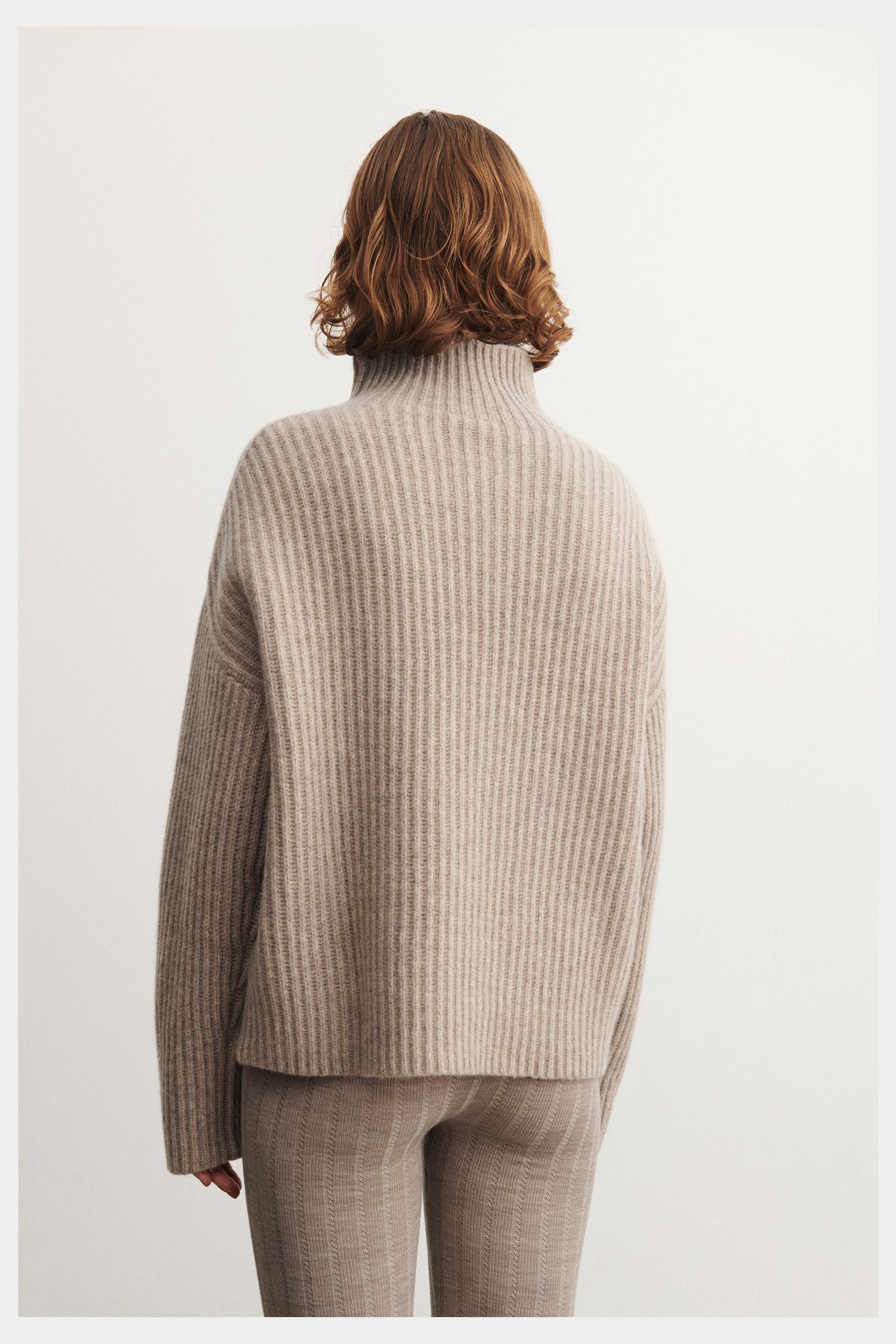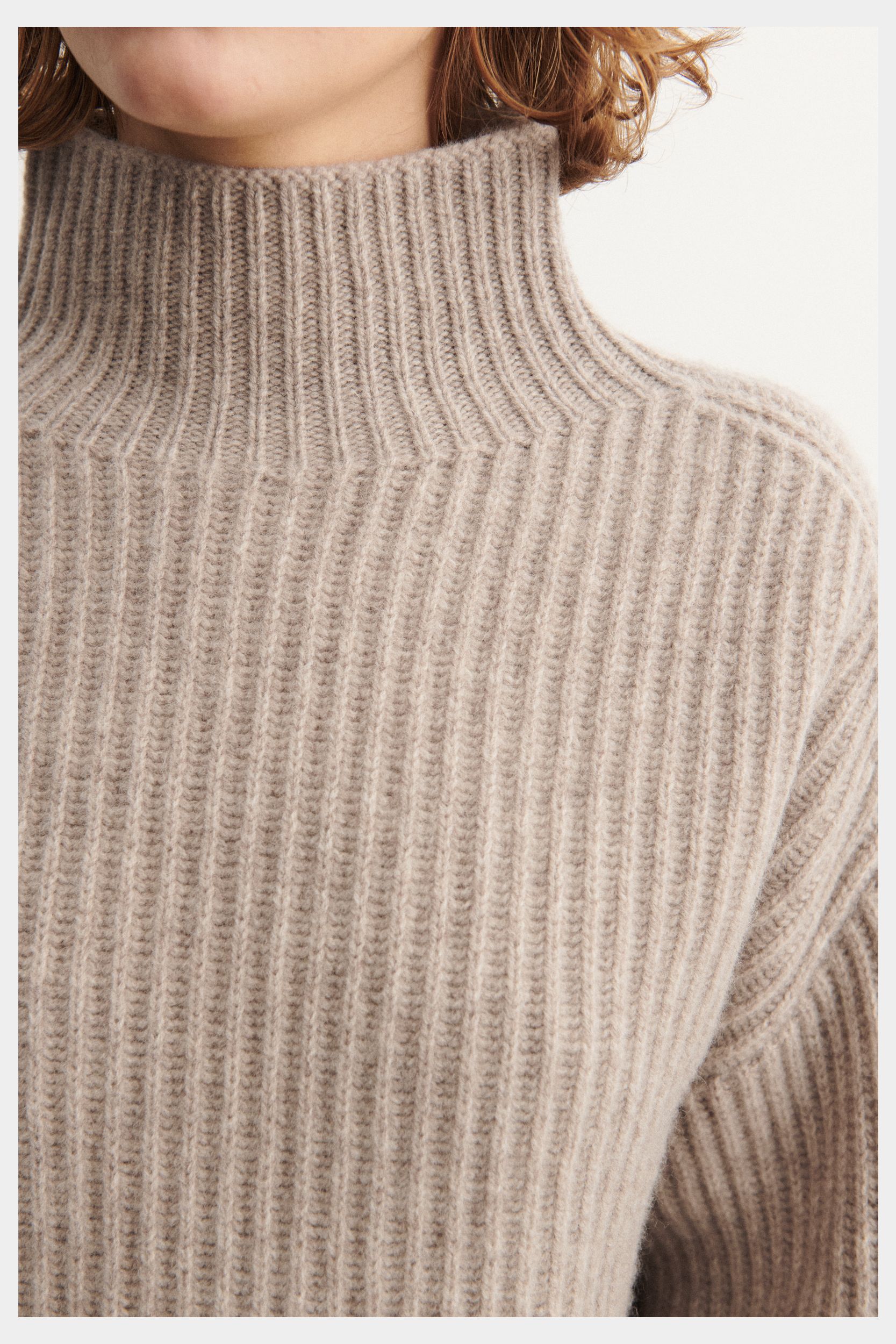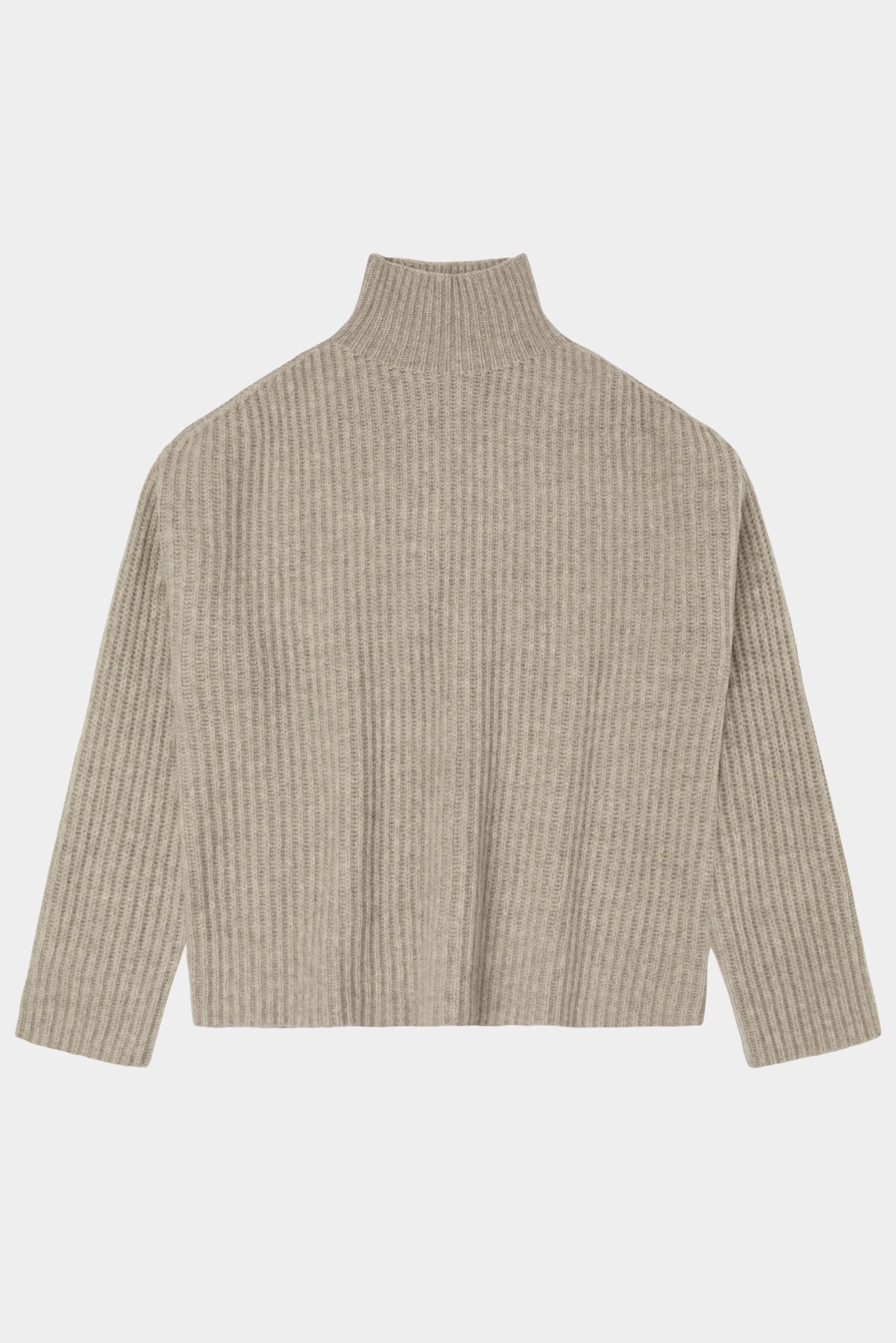 This sweater is knitted in a thick rib structure and has a loose fit. It features a high neckline and dropped shoulders and is made from classic, slightly hairy lambswool. Our lambswool is free from harmful chemicals and source from non-mulesed sheep.
