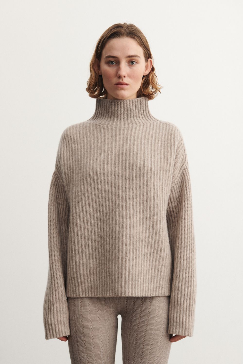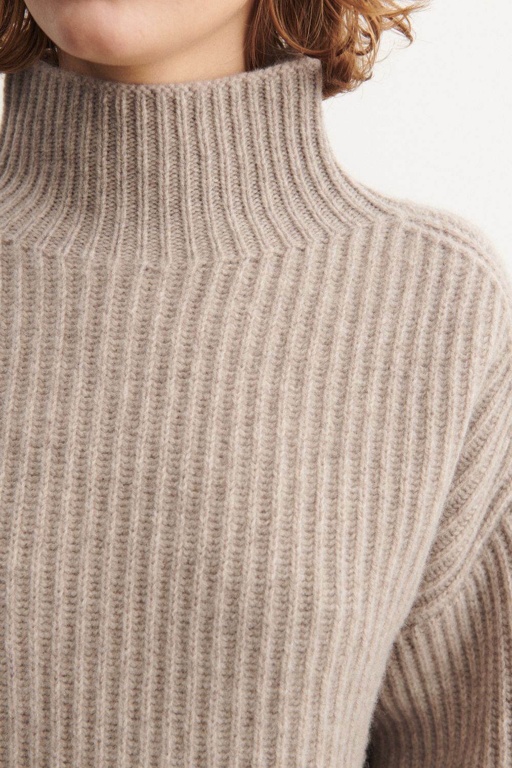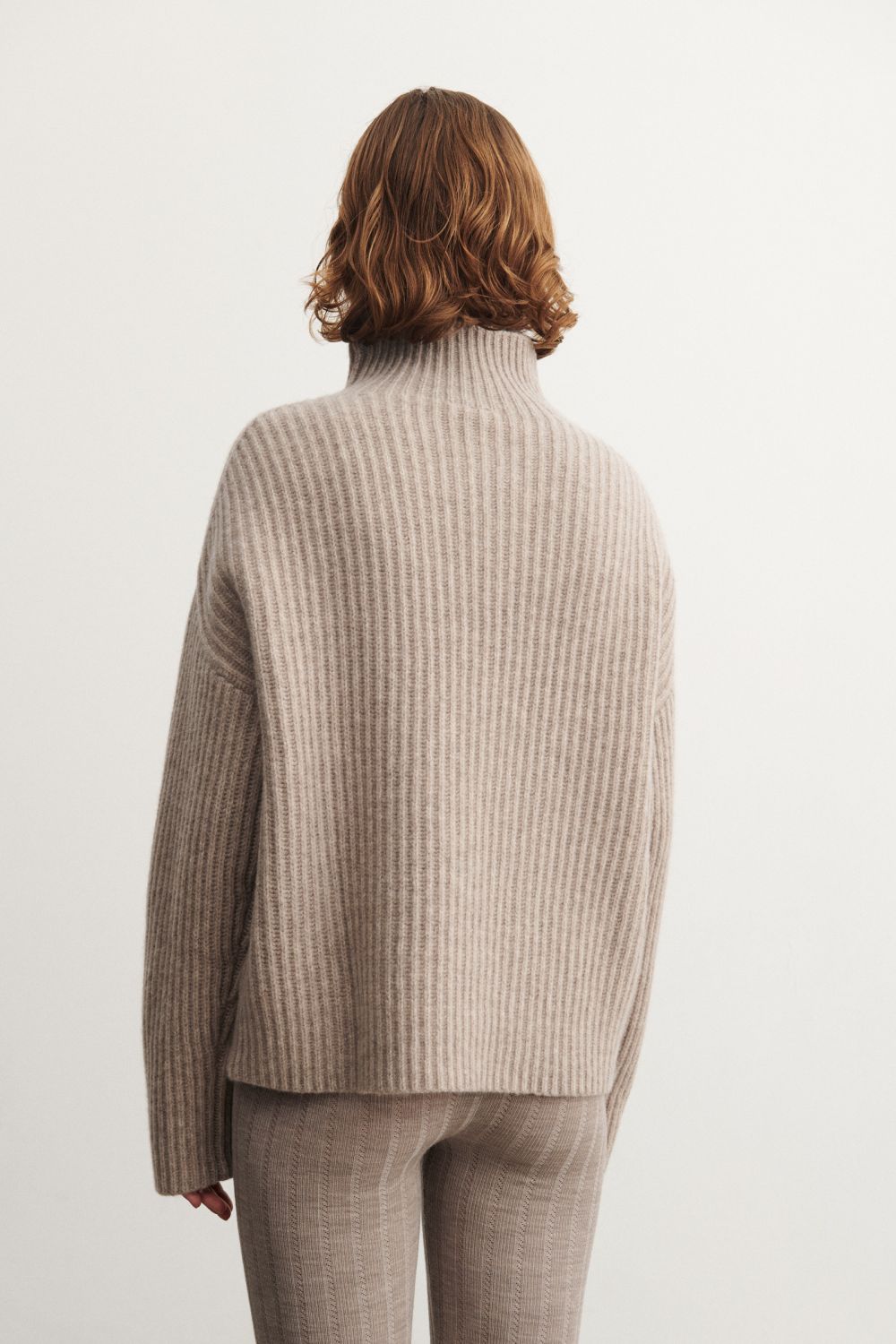 This sweater is knitted in a thick rib structure and has a loose fit. It features a high neckline and dropped shoulders and is made from classic, slightly hairy lambswool. Our lambswool is free from harmful chemicals and source from non-mulesed sheep.