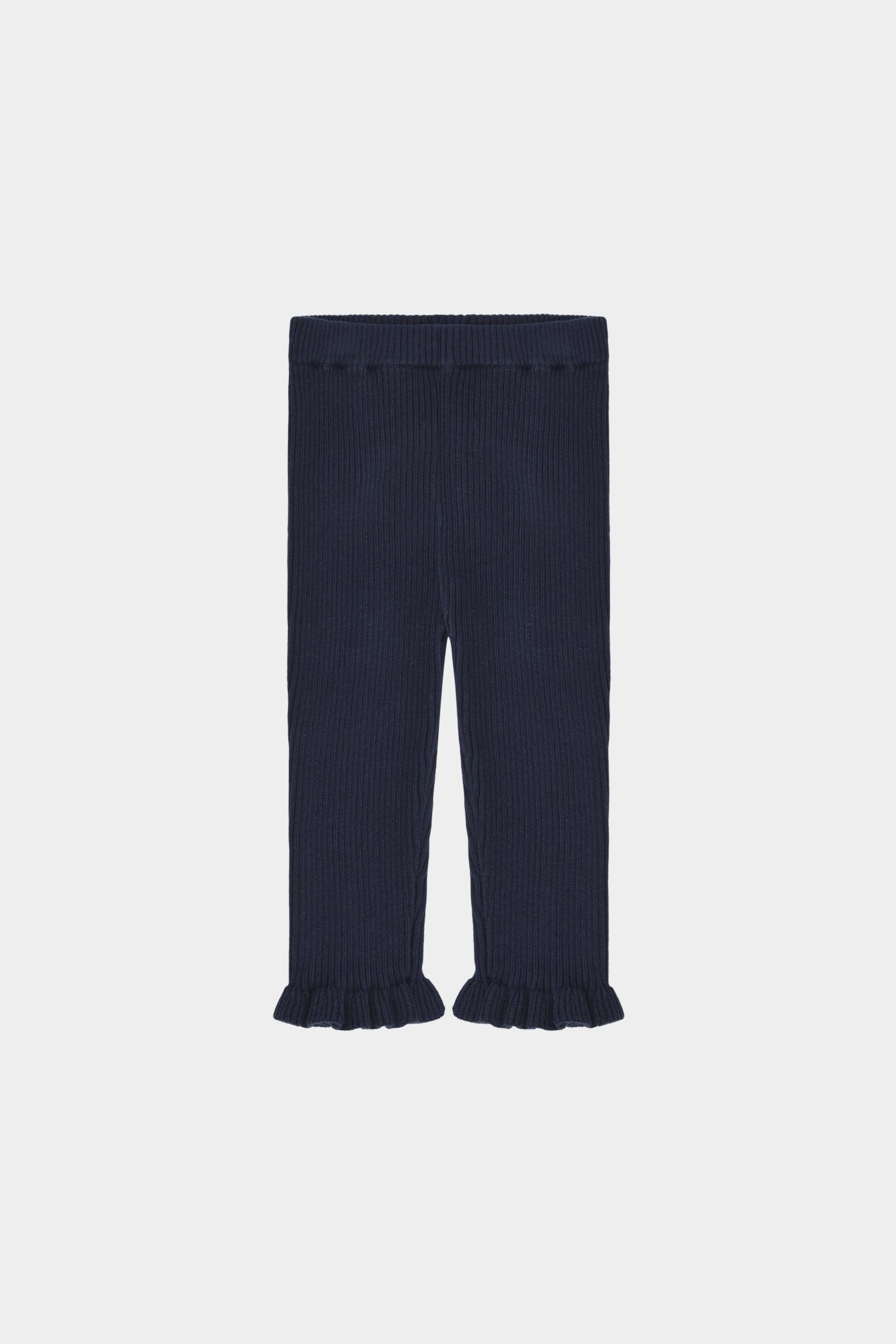 Knitted in a classic rib structure, these leggings are cut with slim legs and a comfortable fit. They feature a soft elasticated waistband that ensures an easy and adjustable fit and a ruffle edge at bottom hem. The stretchy rib structure ensures that this style will fit your child for a long time. Made from organic cotton.